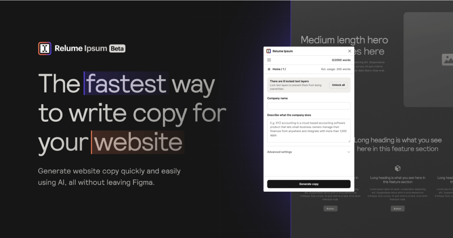 Relume Ipsum is a Figma plugin that leverages AI technology to swiftly produce original and tailored website copy. It streamlines content creation for designers and developers directly within the Figma platform.