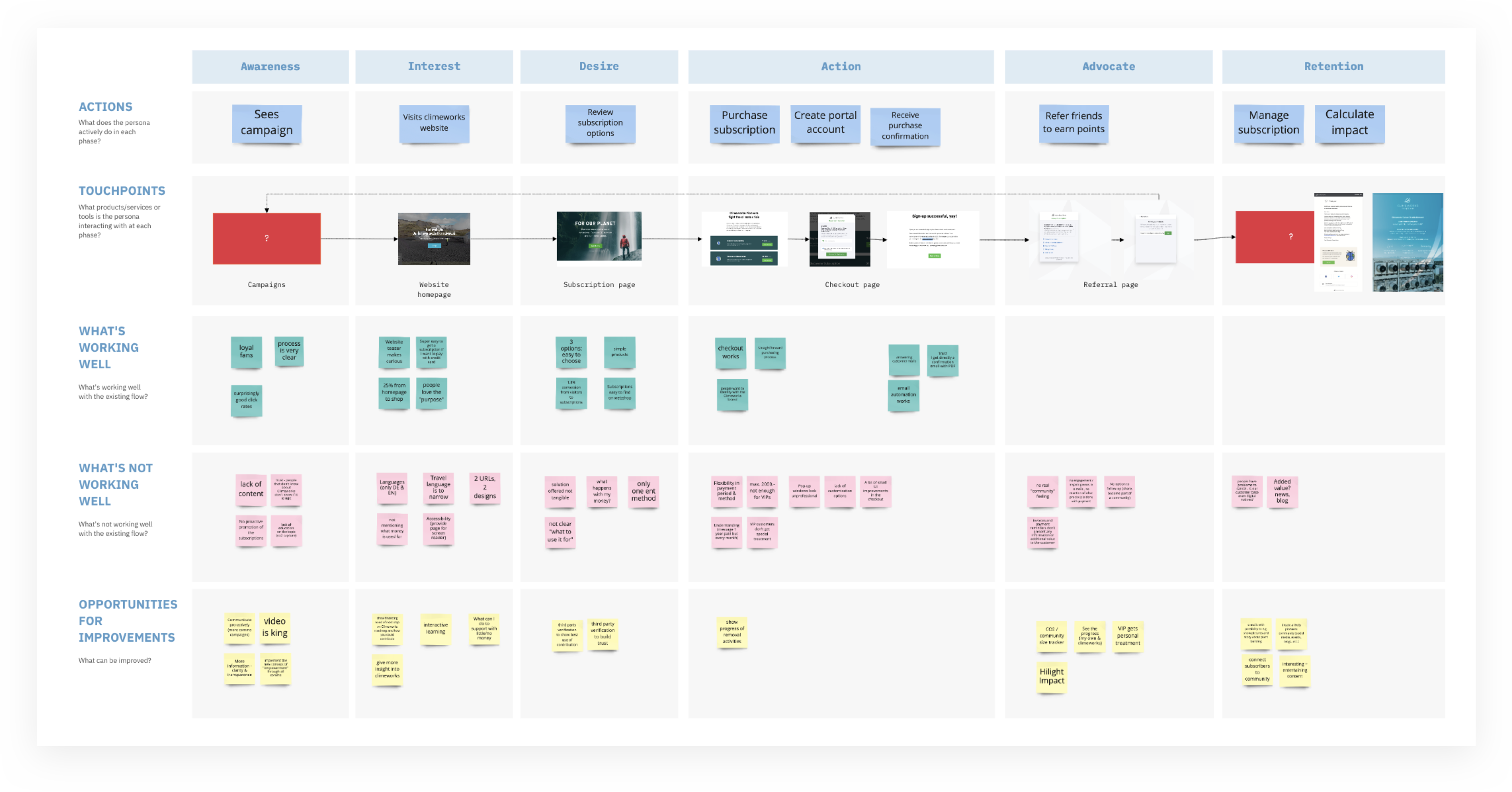 For the Customer Journey Map, you can build upon your work during the Understanding Phase. Initially, you can start by drawing a Customer Journey Map first (As-Is Customer Journey) based on what we already know before we conduct customer research. Afterwards, you have identified some gaps and validated some assumptions, which real data from the field can now replace.
