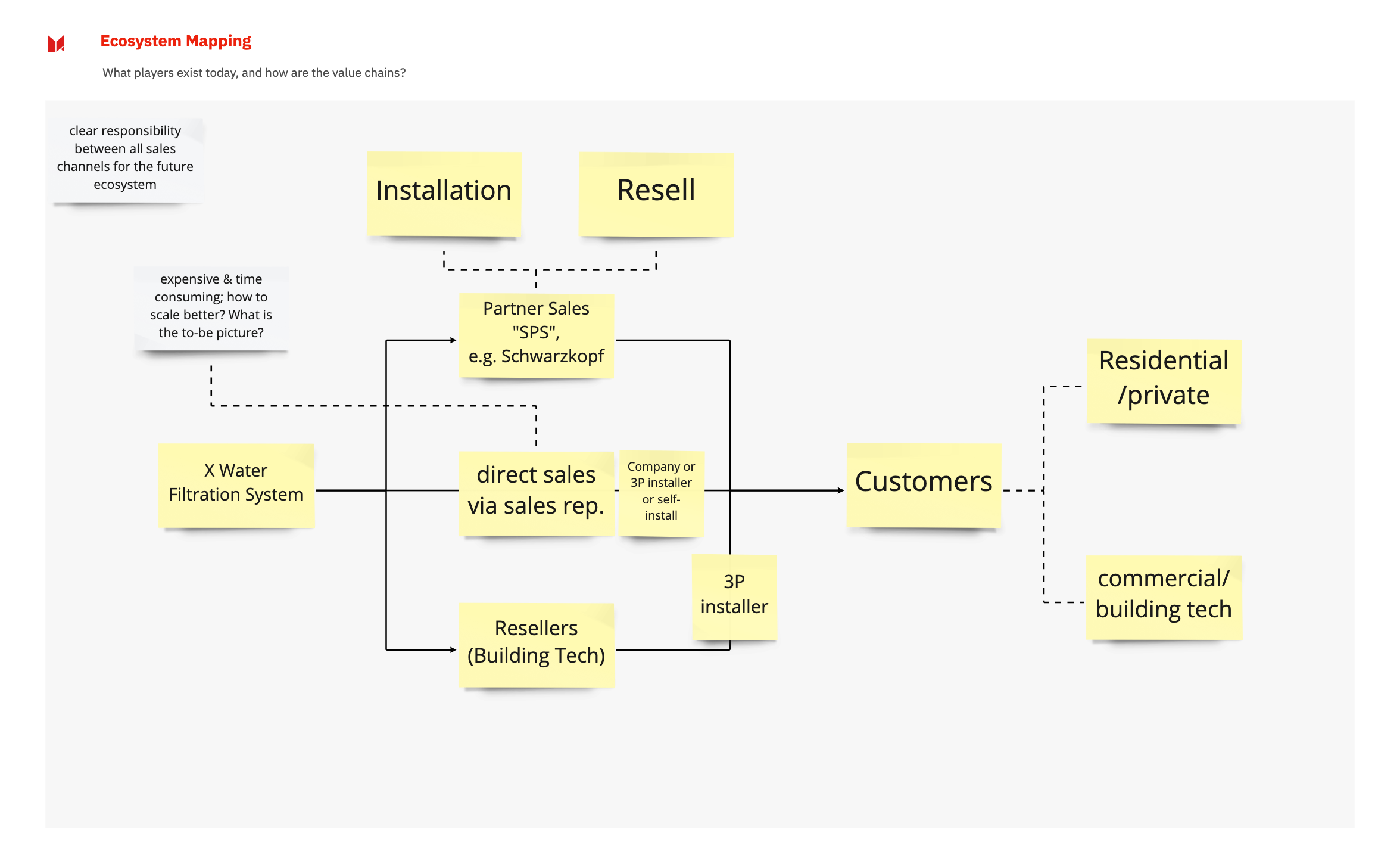 Example 01 presents an overview of the selling water filtration system ecosystem; it’s a quick exercise to clarify current channels and connections and identify weak links/processes. This ecosystem focuses on the channels, and there is no focal point.