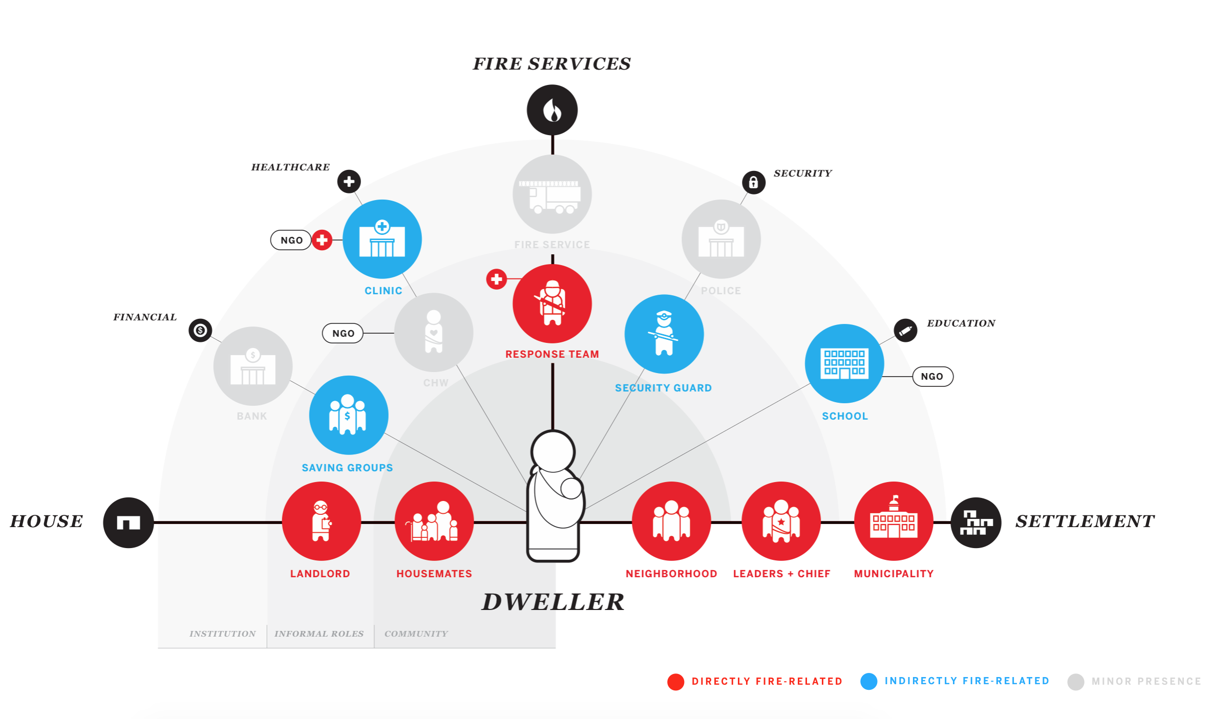 Example 02 visualises all the services and actors involved in fire prevention and intervention and be able to compare different context. This ecosystem puts users (dweller) at the focal point and then connect others at different layers.
