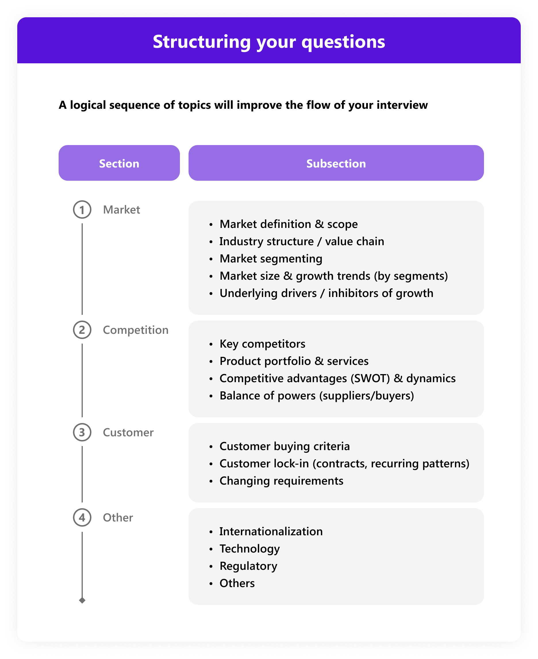 Avoid bias in your questioning. Instead, hide your hypothesis from the expert and ask broader questions. For example, instead of asking: "Are customer purchases more driven by price or is it still quality?" it's best to be neutral and ask, "Can you elaborate on the key customer purchasing criteria and indicate which of them is more important?"