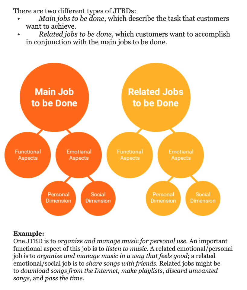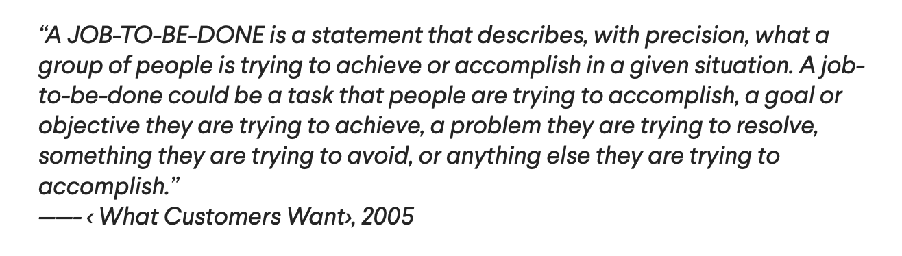 Jobs-to-be-Done is based on the economic principle that people “hire” products and services to get “jobs” done, i.e., to help them accomplish tasks, achieve goals and objectives, resolve and avoid problems, and make progress in their lives.