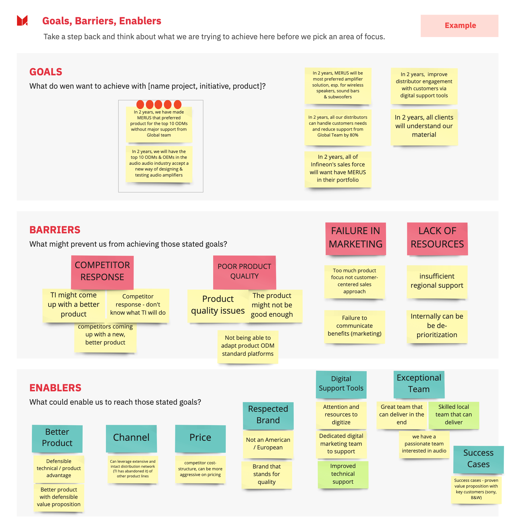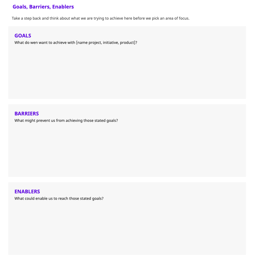 After we have set goals, further clarity can be gained by addressing underlying barriers and enablers to achieving this goal. This exercise helps us identify future blockers we should be aware of and accelerants we can and should leverage for success.