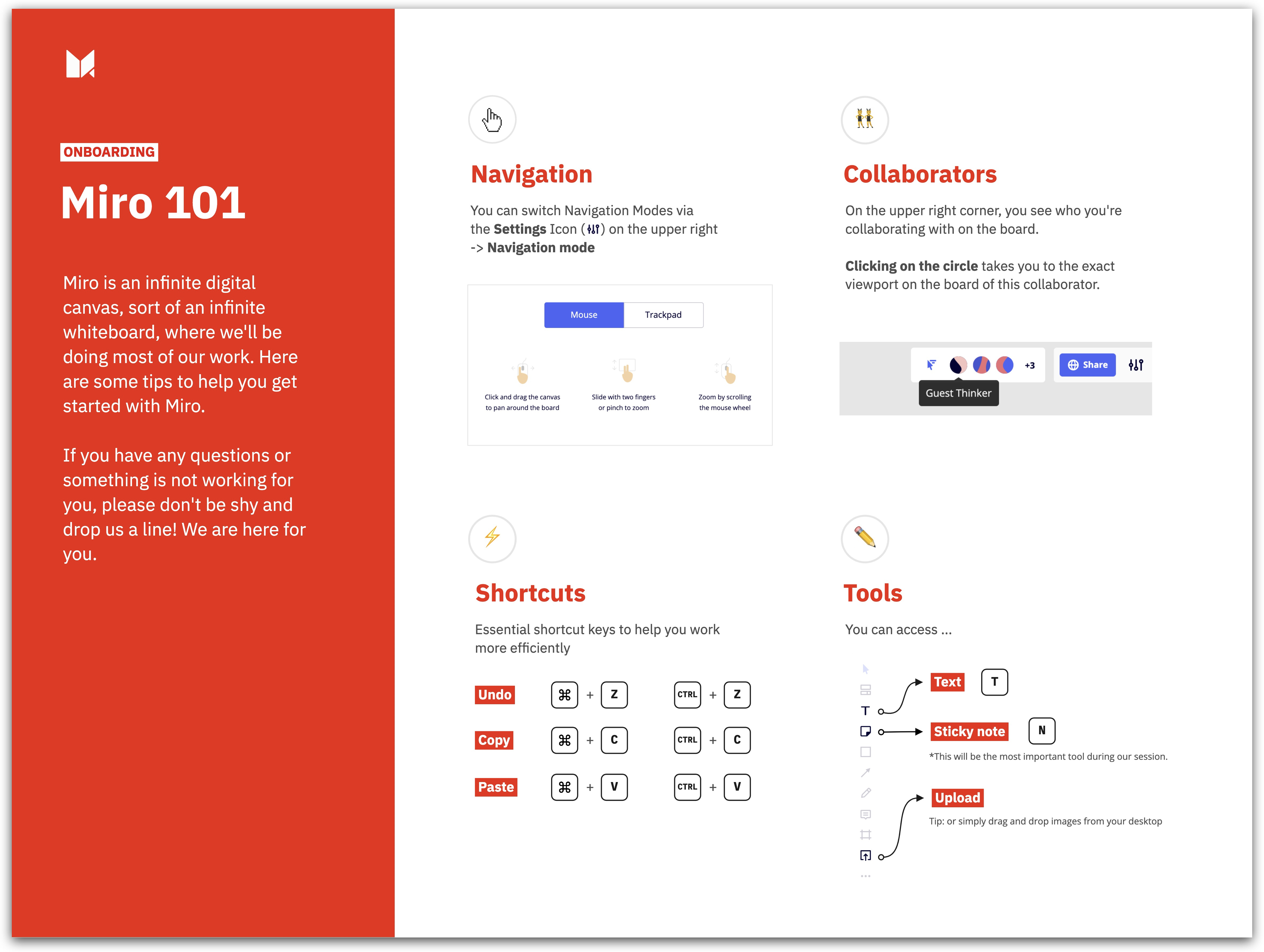 During your project, you will use collaboration tools, such as Microsoft Teams, Miro, or Google Slides. Ensure every team member has access to them and knows how to use the tools. Make sure first to explain the main functionalities of the tools and then reserve enough time to let the team do some easy exercises to get familiar with the tools if needed (e.g., create and move around post-its, draw connection lines, write in a text field).