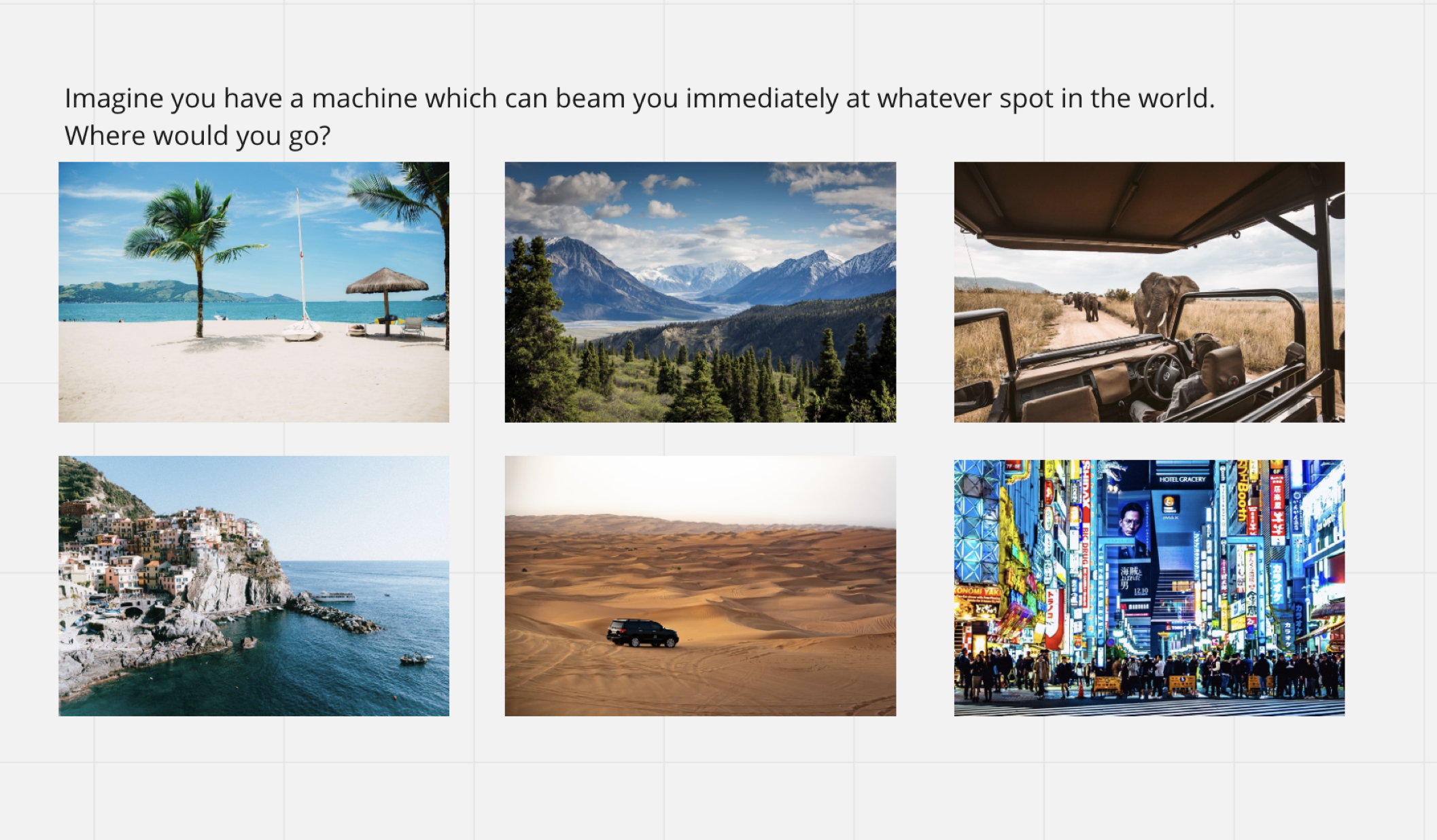 You can see such an icebreaker question in the example to your right. Give the team 2 minutes to think about their favourite spot on earth.