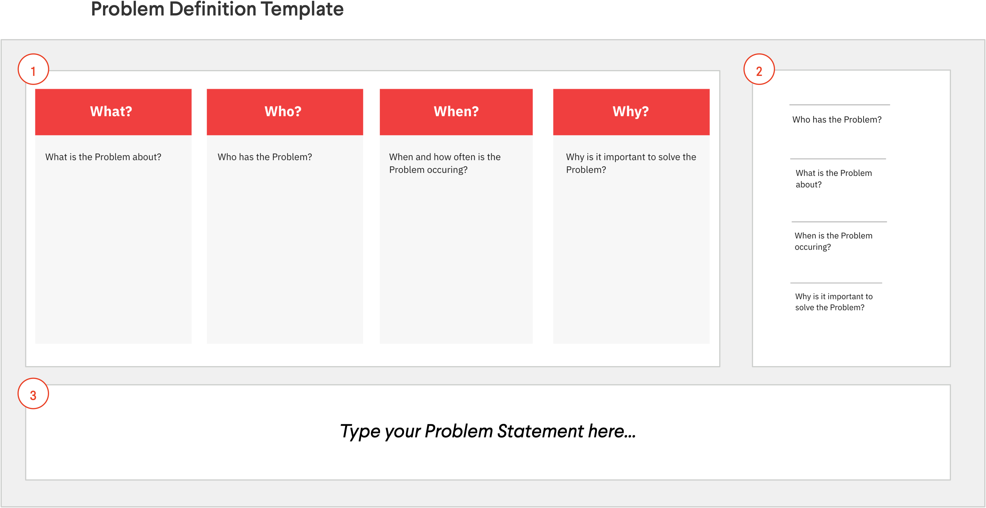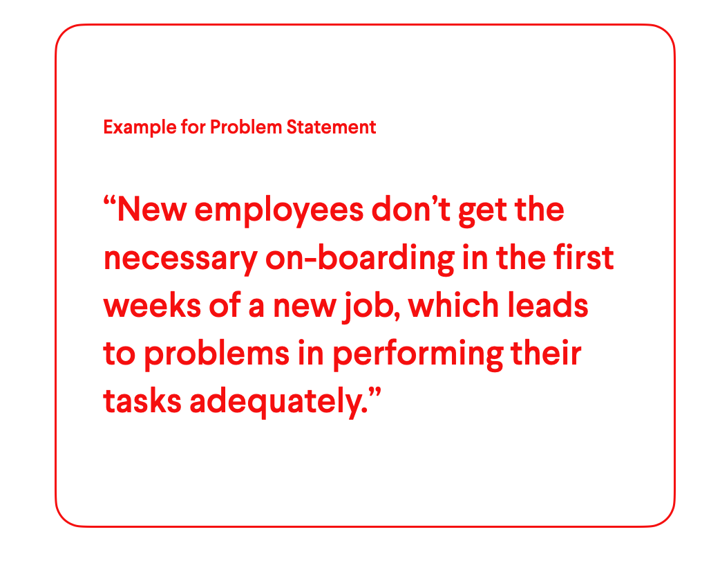 Always try to define a Problem Statement when you want to articulate a problem and provide a clear-cut objective to work towards. We suggest you use this approach right upon the start for you and your team to get a better understanding of the challenge at hand.