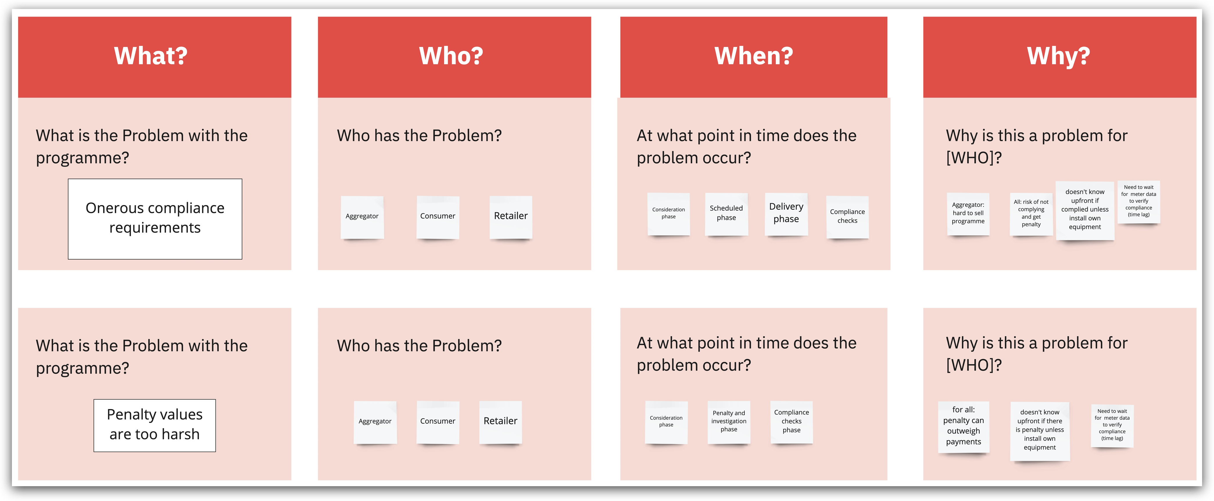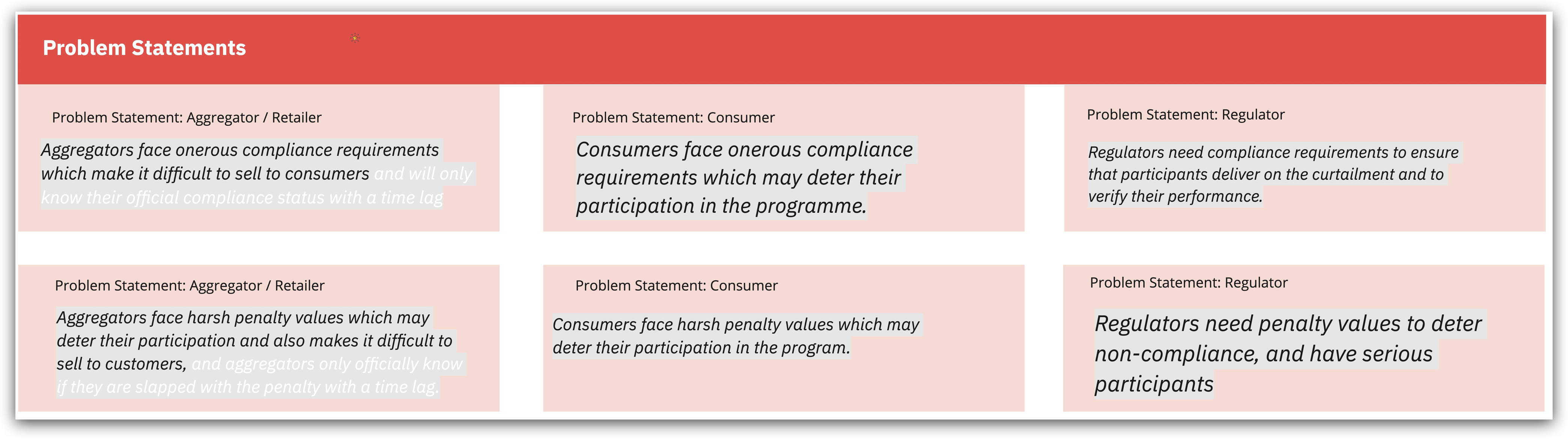 For a larger program or product endeavour, there can be multiple problem statements for different stakeholders, as complexity increases with the number of target customers/customers, like in the example on the right.