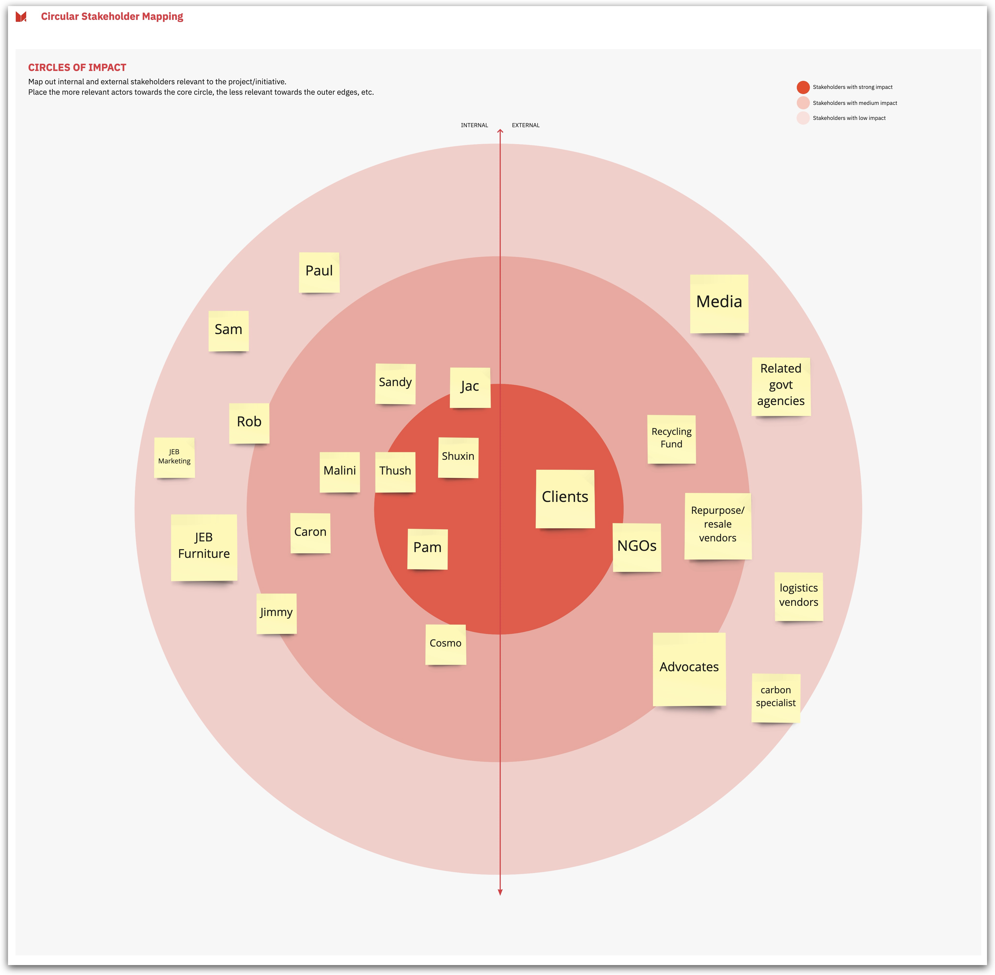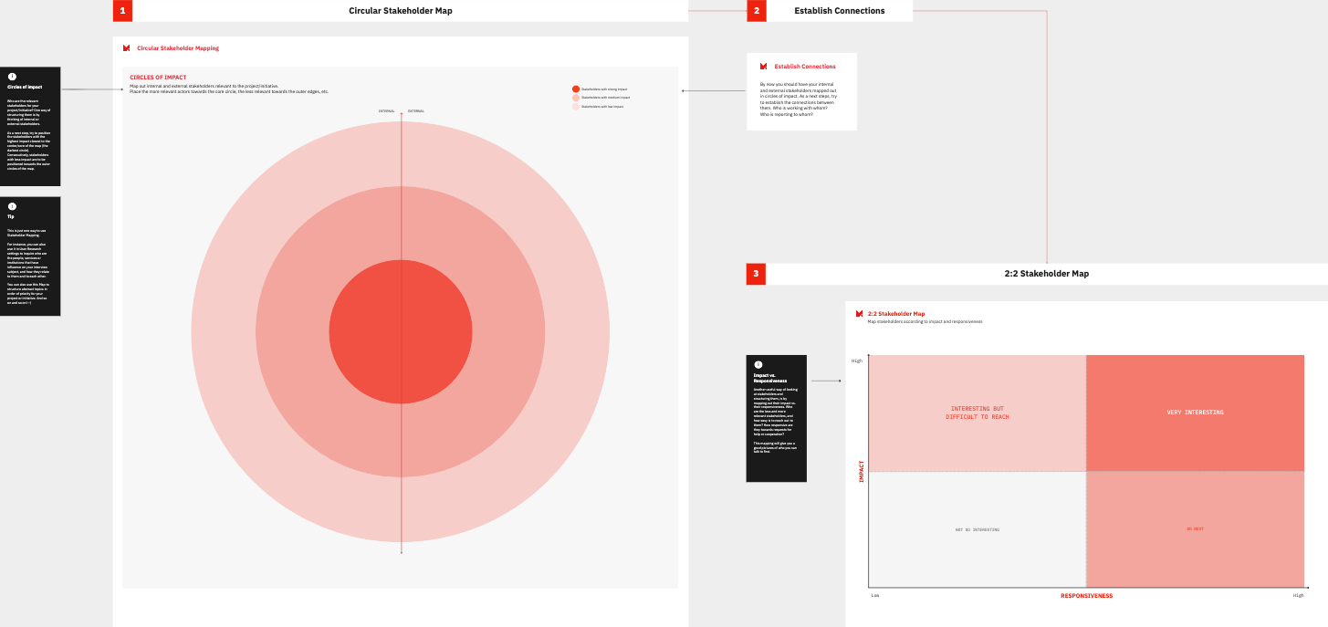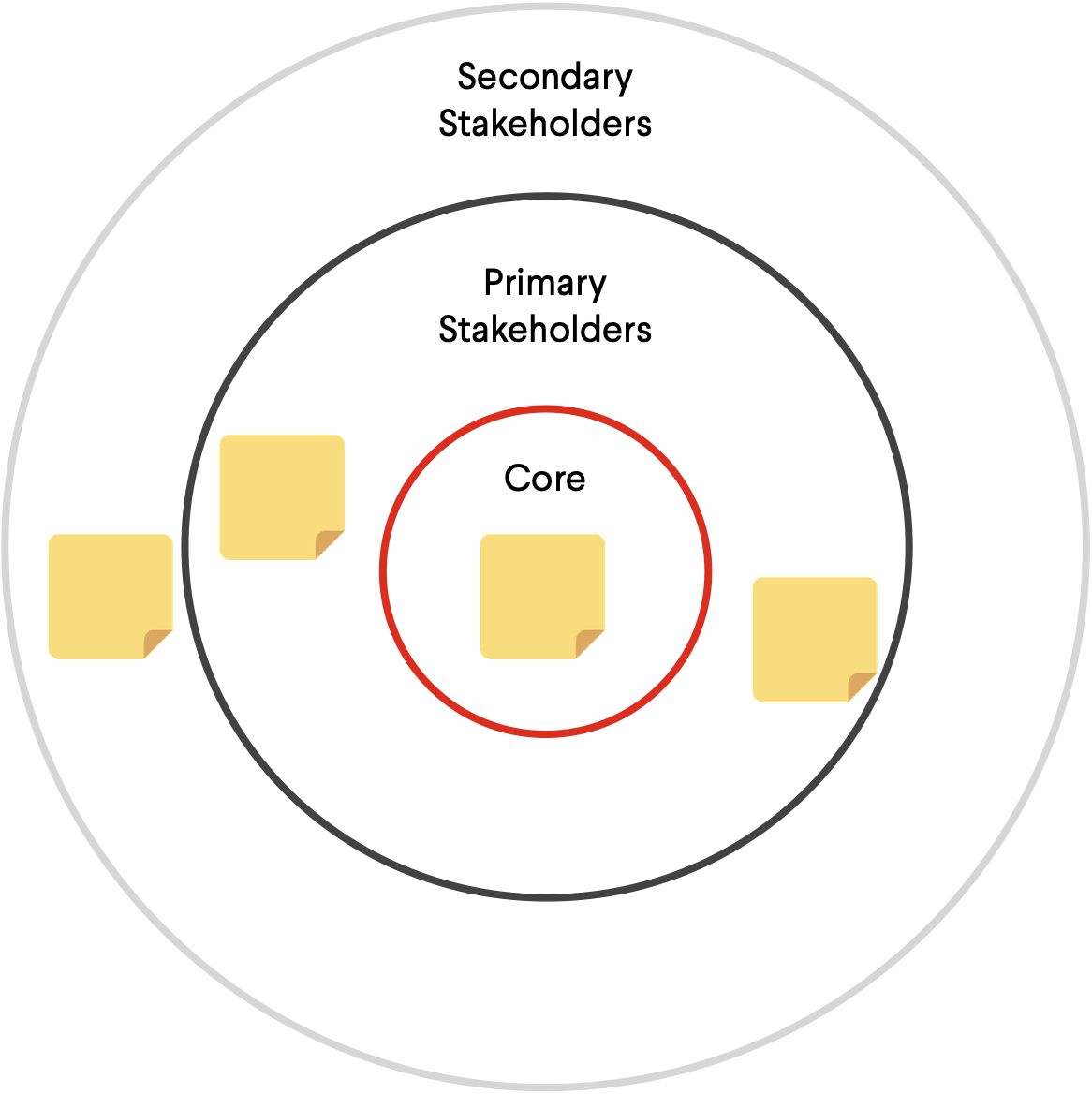 A Stakeholder Map gives an overview of all the people or parties involved in or influenced by your project. By categorising them into the core, primary and secondary stakeholders, you can better understand the dynamics and decision power among the different stakeholders and whom to involve in your process.