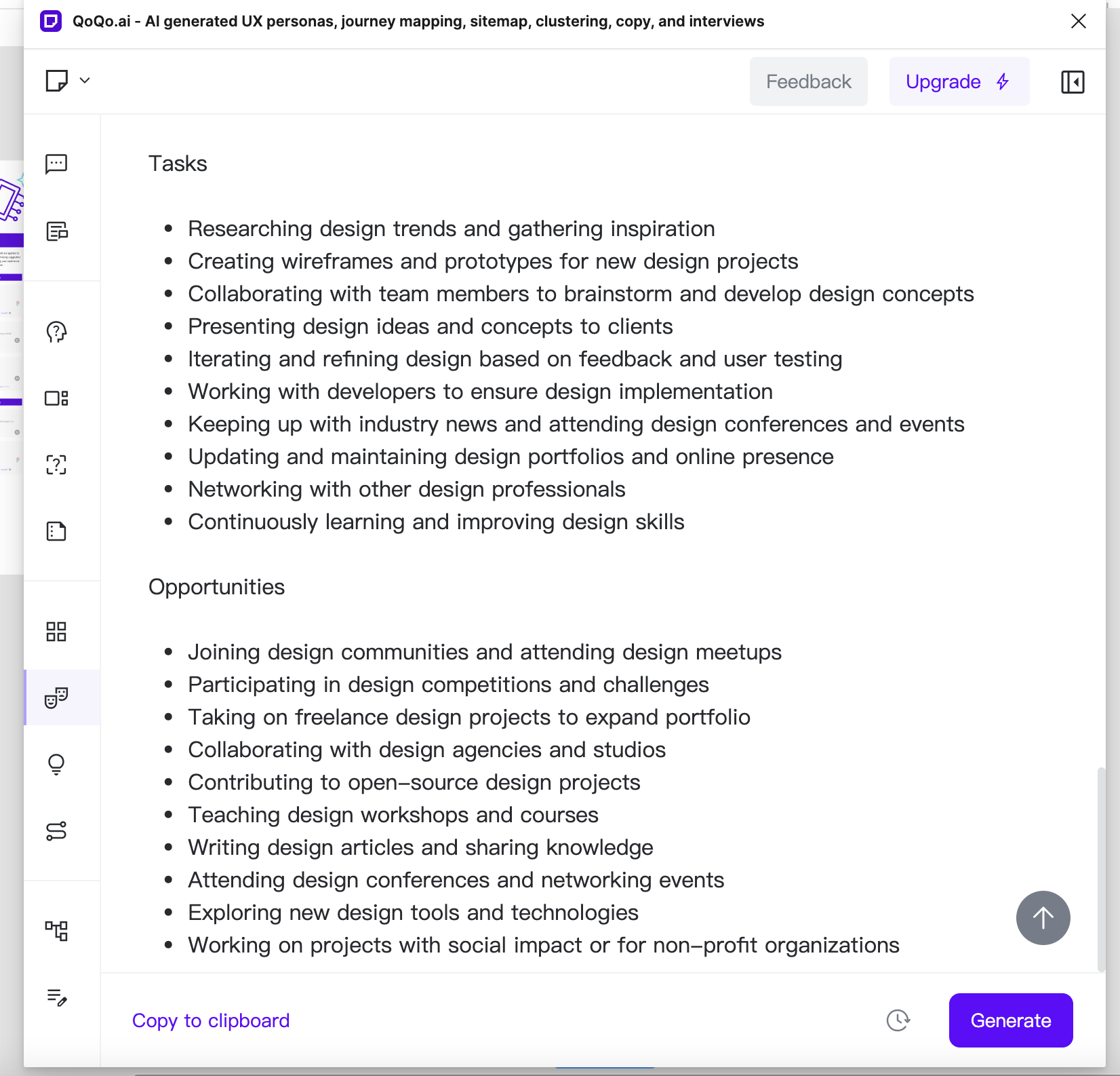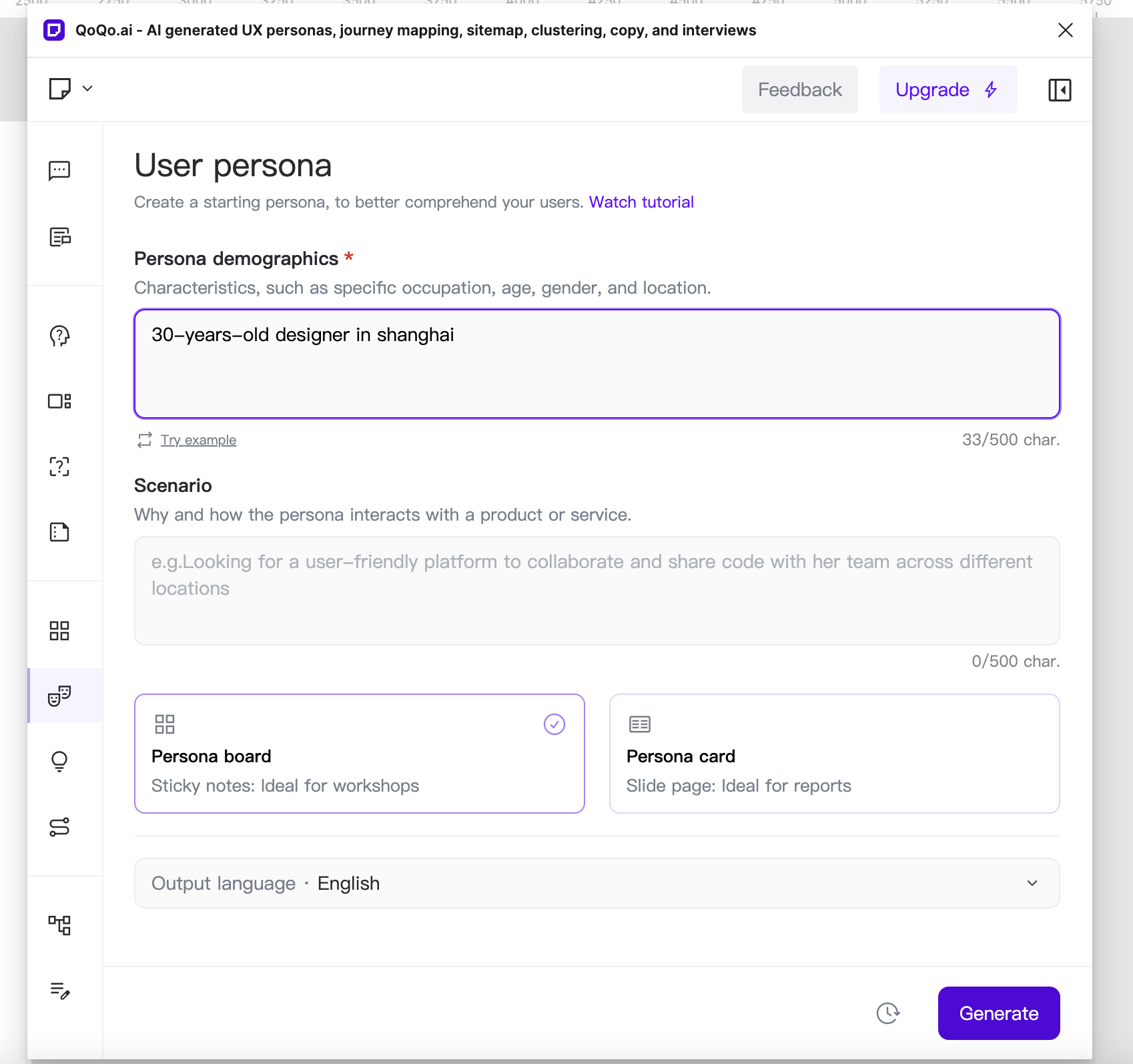 QoQo's user role creation feature is designed to assist users in quickly and easily generating specific user roles. Through simple steps, users can select "Personas" from the menu, input relevant details, and click the "Generate" button to complete the process. This functionality aids designers in gaining a more effective understanding of the target audience, enhancing the accuracy of product design and overall user experience.
