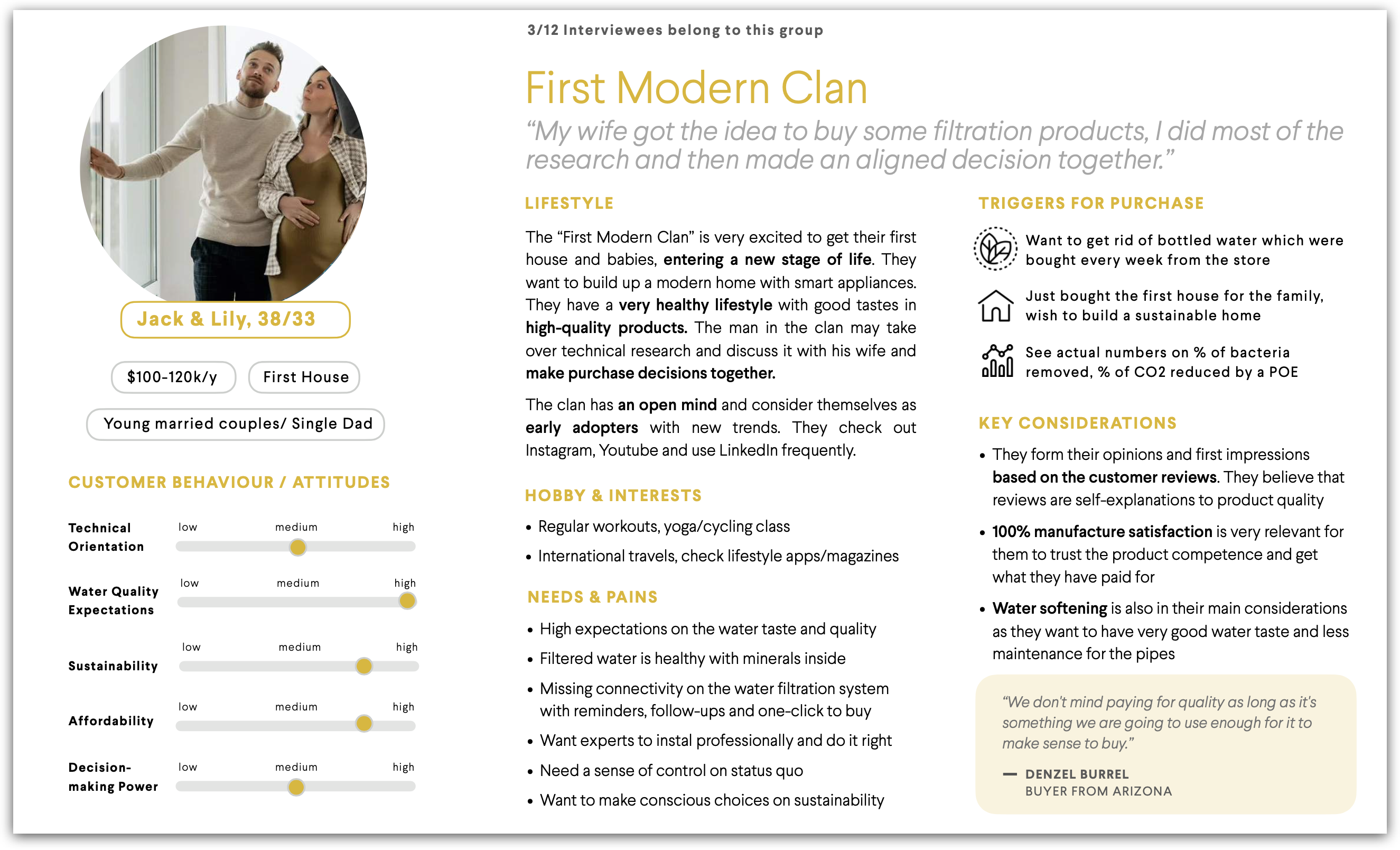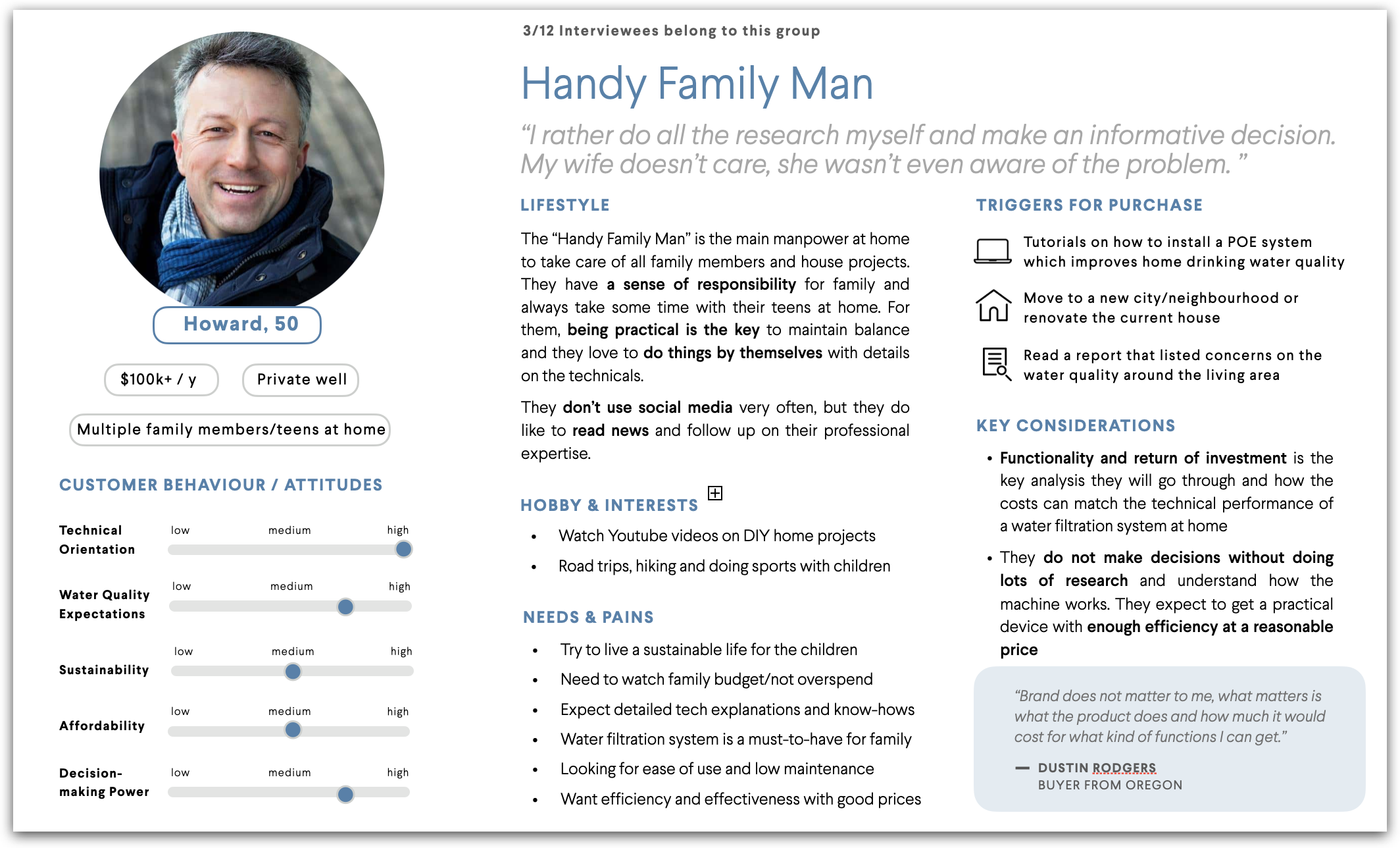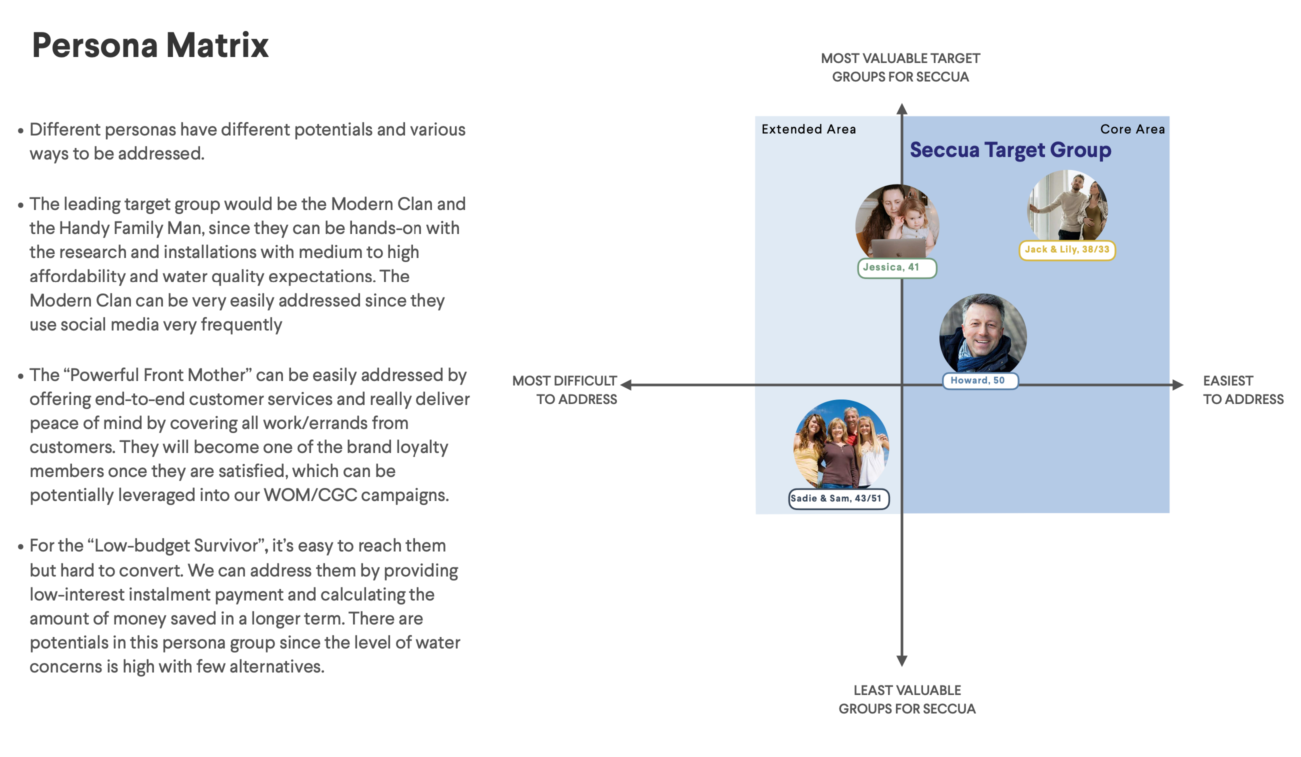 After categorising differences and similarities on different topics, such as needs and pains, attributes, and purchasing considerations, you can finalise the clustered findings for each persona profile. This would be a holistic description of this group of customers, with detailed information, marketing, and communications will also be able to address this persona accordingly.