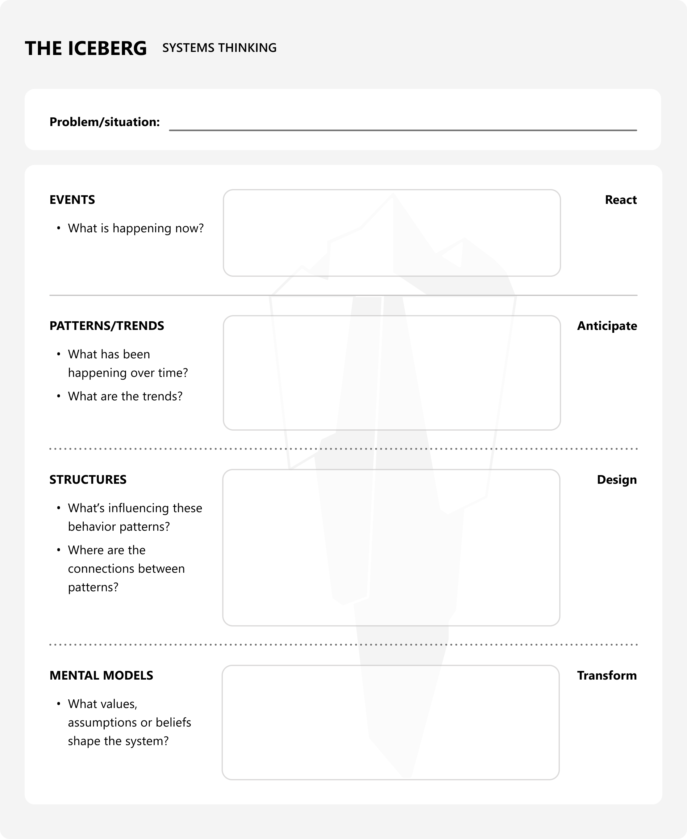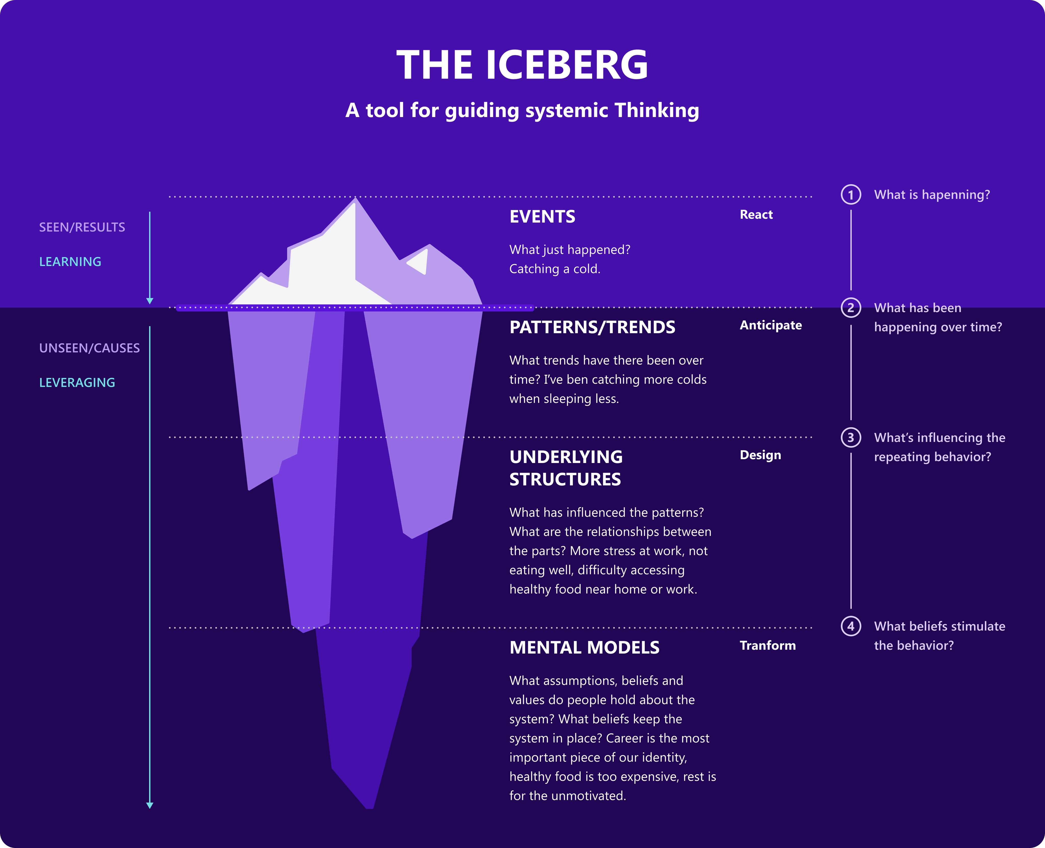 The iceberg model of systems thinking is a way of understanding the origin of a problem. An iceberg is a perfect metaphor for the problems we are experiencing because of what’s visible. But if we react based on a visible event, not going beneath what’s apparent and unravelling the motivations that caused the problem, we might be unable to resolve it. By applying a four-step model, you can reach the core issue and find a better solution.