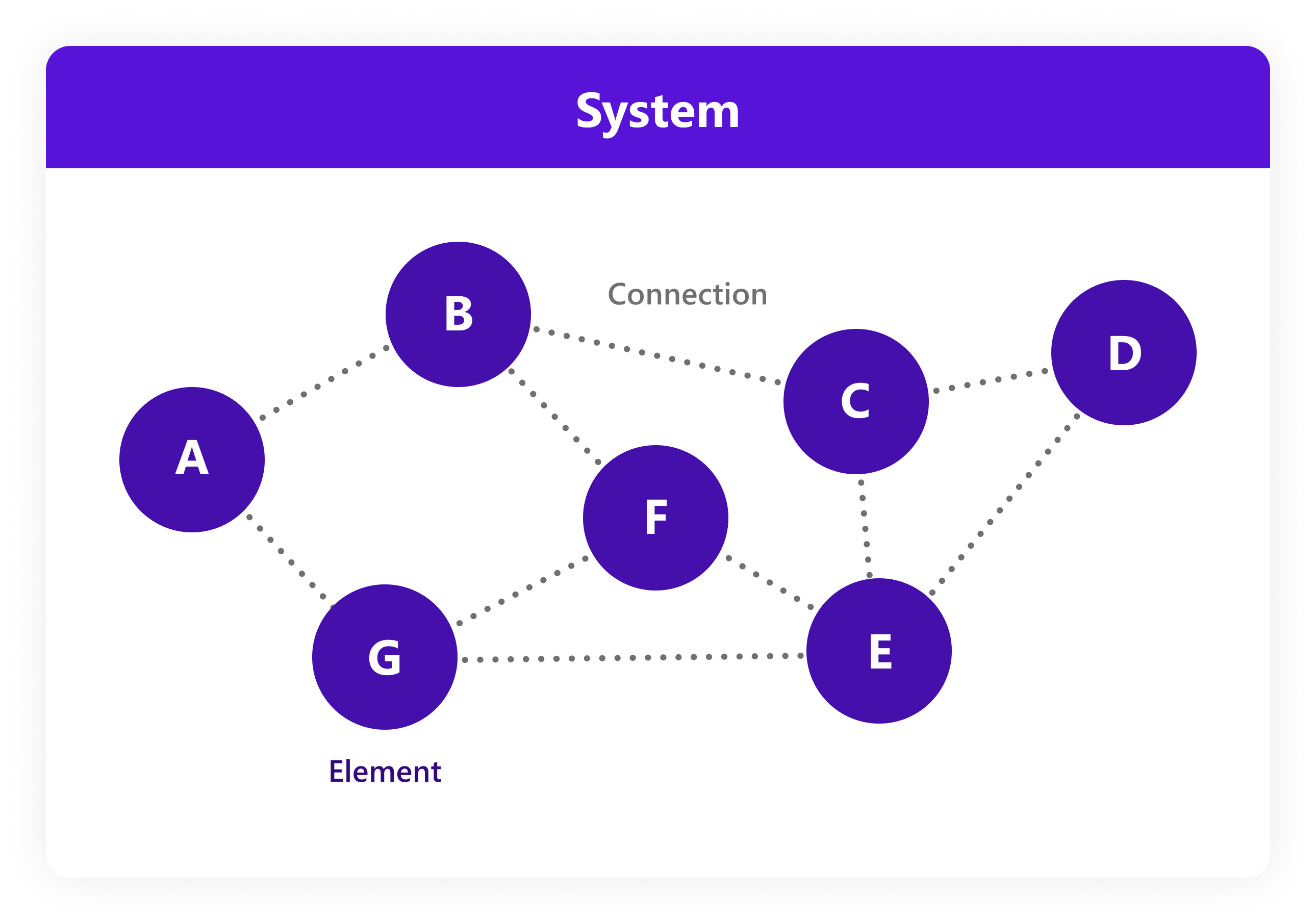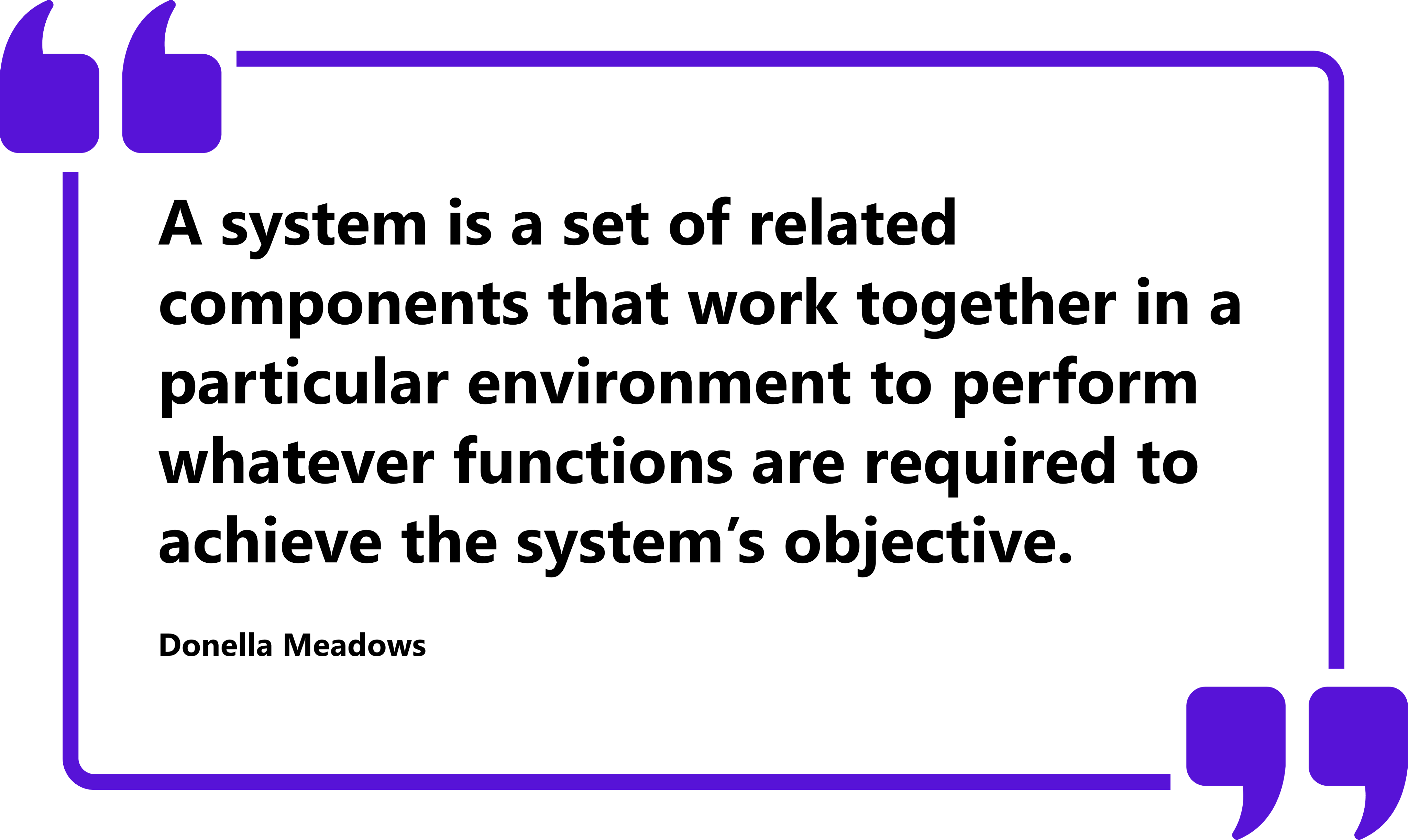 To understand systems thinking, we must first understand what a system is. A system is the interaction or relationship of essential parts that are organised in a way that achieves something. It must have parts that are somehow related to each other, and there must be a purpose or function. So the relationship of elements is integral to a system. And the outcome of all the interconnected parts is the function or purpose of the system.