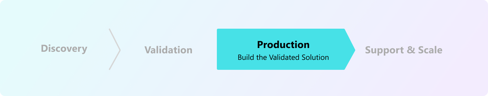 The objective of the Production Phase is to efficiently build the Minimum Viable Product which has been previously validated in the market, and keep on reducing market risk along the way by testing early Alpha and Beta versions with customers and iterating further.