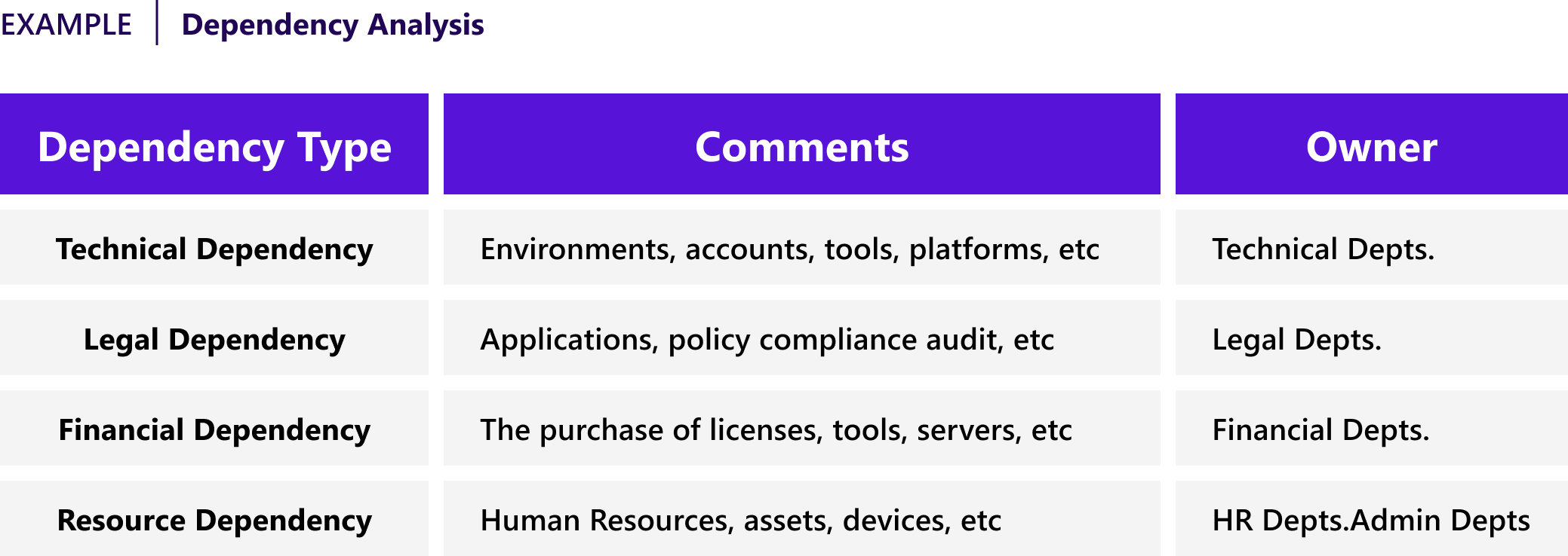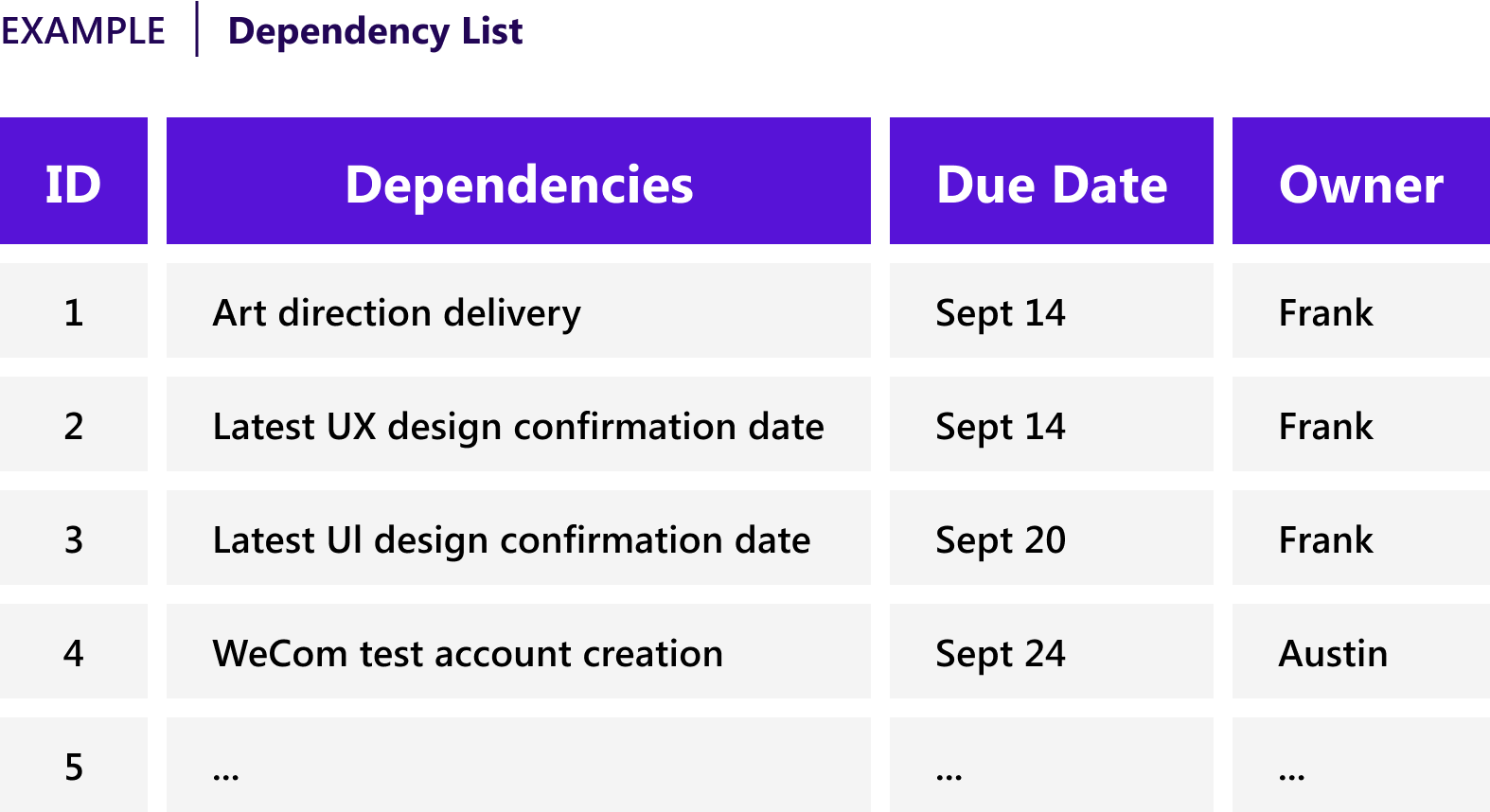 Here is a checklist example of common dependencies. It’s important to go over the possible dependency checklist ahead of the project and plan the coordination in advance. However, the types in the real world are not limited to this example.