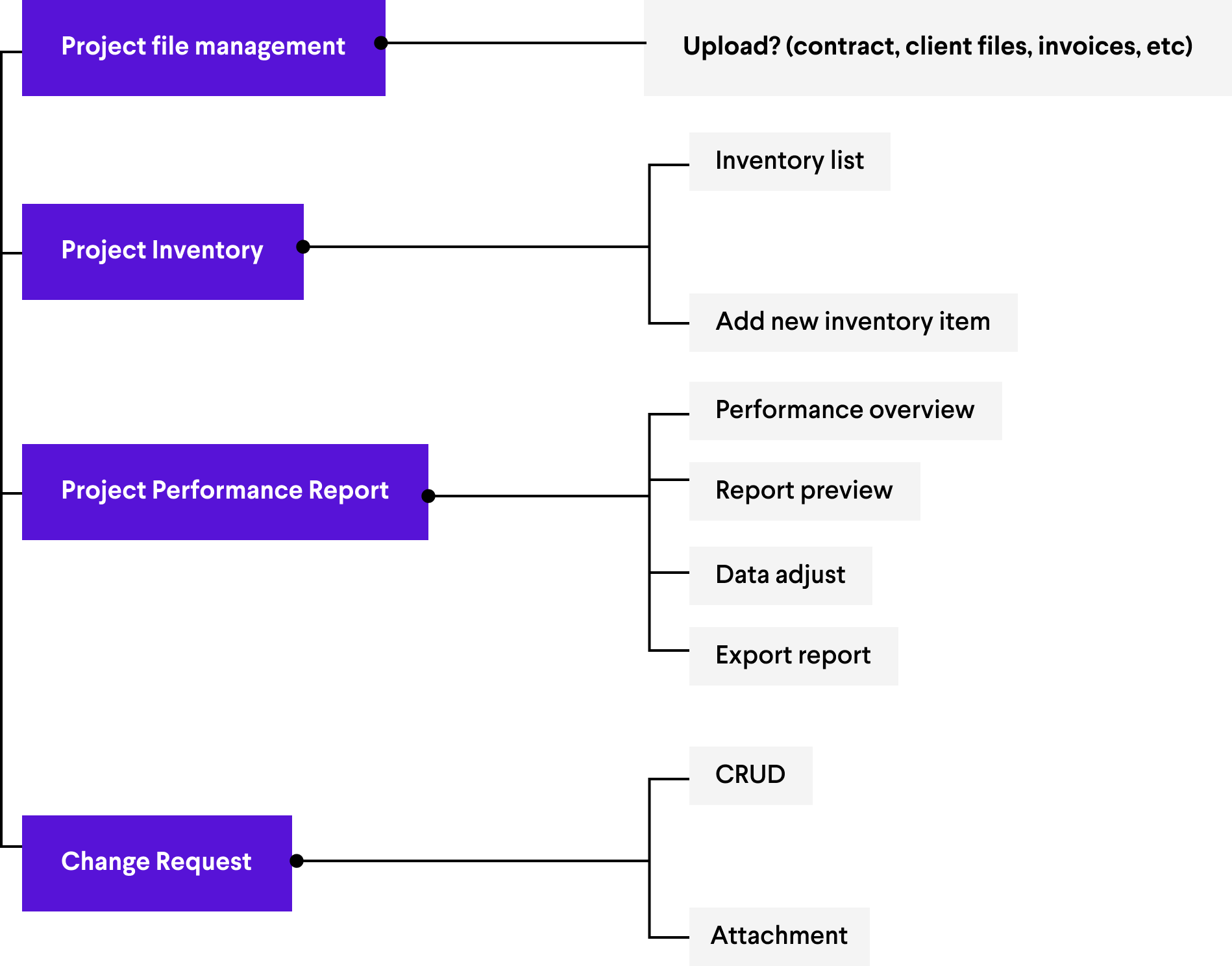 A well-written feature tree contains all the critical features in a high-level and structural format, which could ensure all the stakeholders and design and development teams have a common understanding of the requirements. Then the design and development team could perform further actions based on it, including wireframe design, feasibility study, etc.