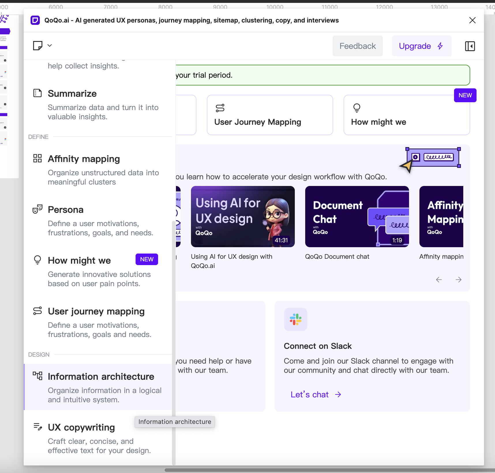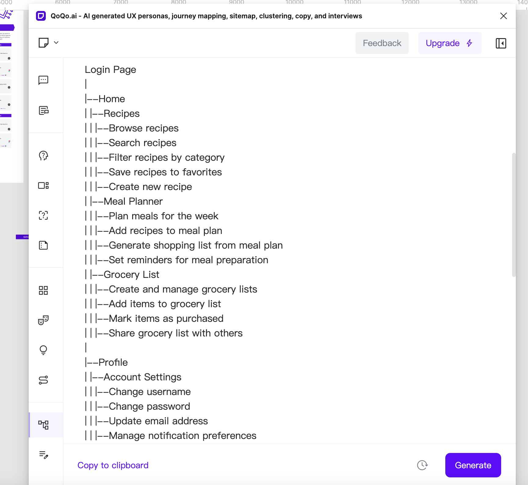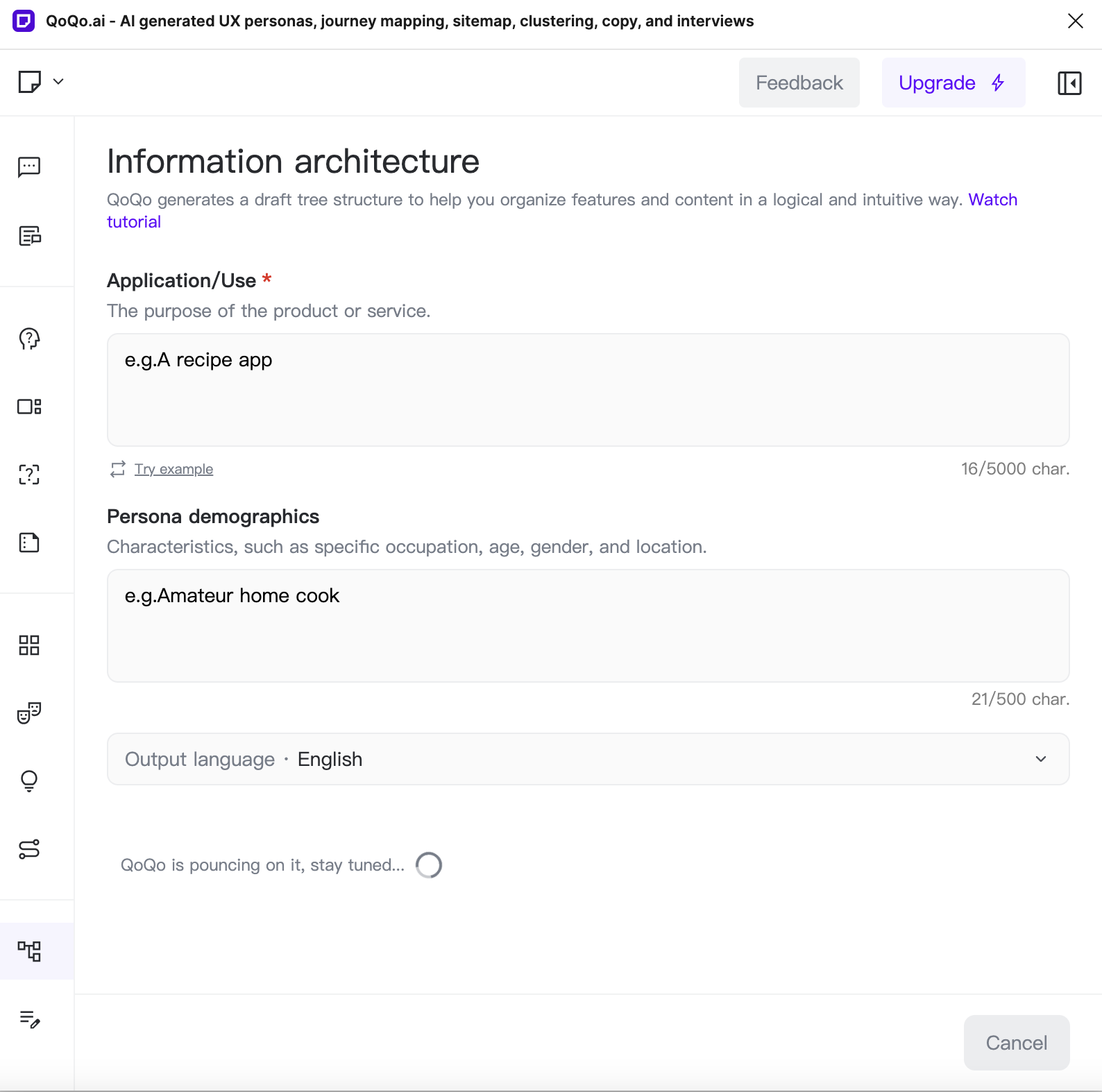 With QoQo AI's "Information Architecture" tool, you can create well-structured designs for websites or apps effortlessly. QoQo generates a draft tree structure to help you organize features and content in a logical and intuitive way.