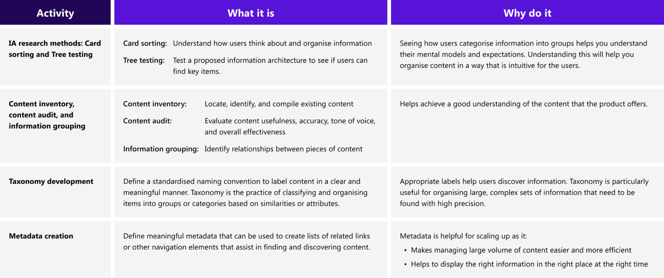 Information architecture (IA) is organising, structuring, and effectively labelling content that makes it easy to find and understand. IA design aims to help users quickly find Information, complete tasks, and achieve their goals. An effective IA prioritises users’ mental models and helps them understand where they are, the content they’ve found, and what's around.