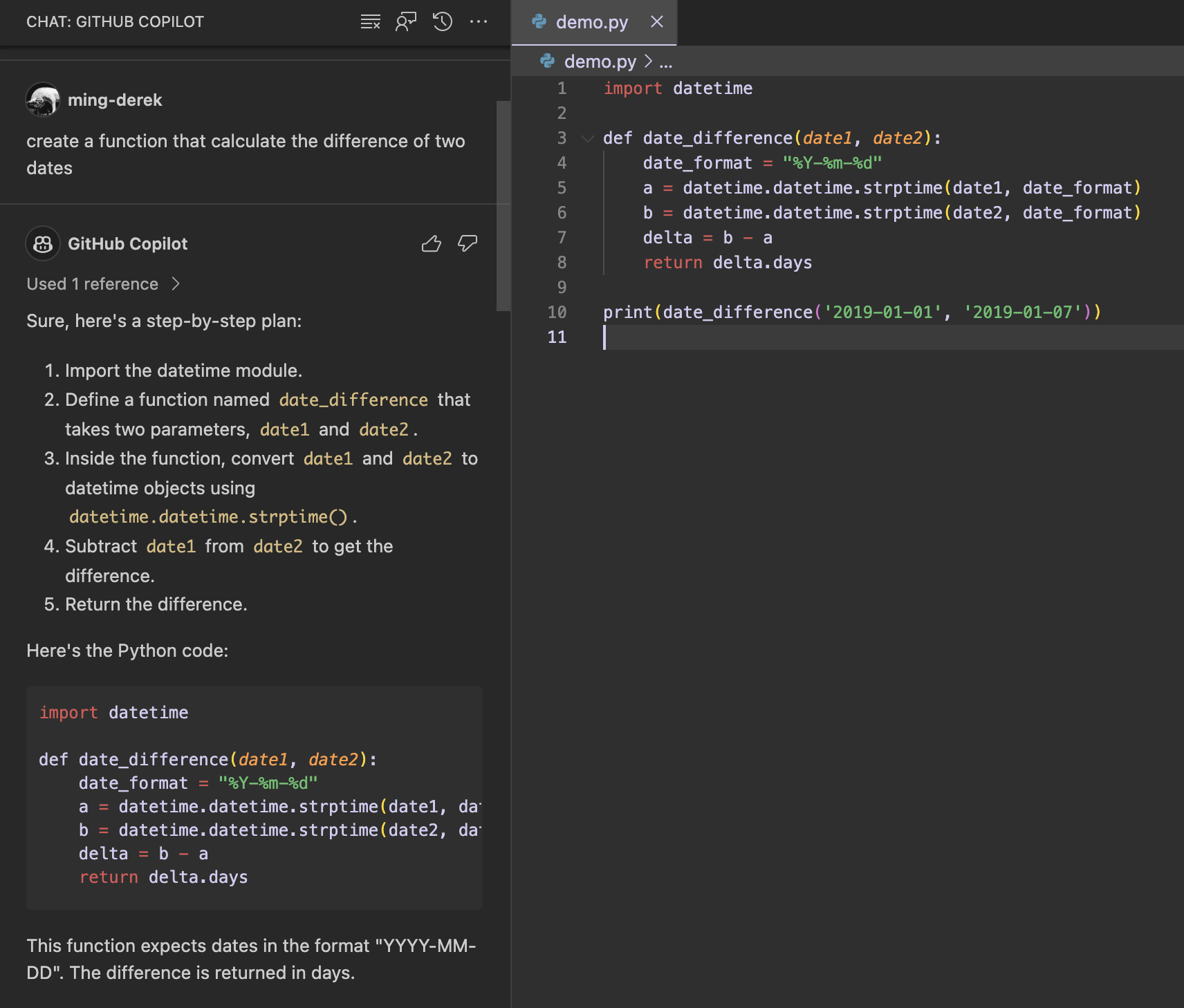 In the example, a prompt “create a function that calculates the difference of two dates” is sent, and a working code snippet is returned.