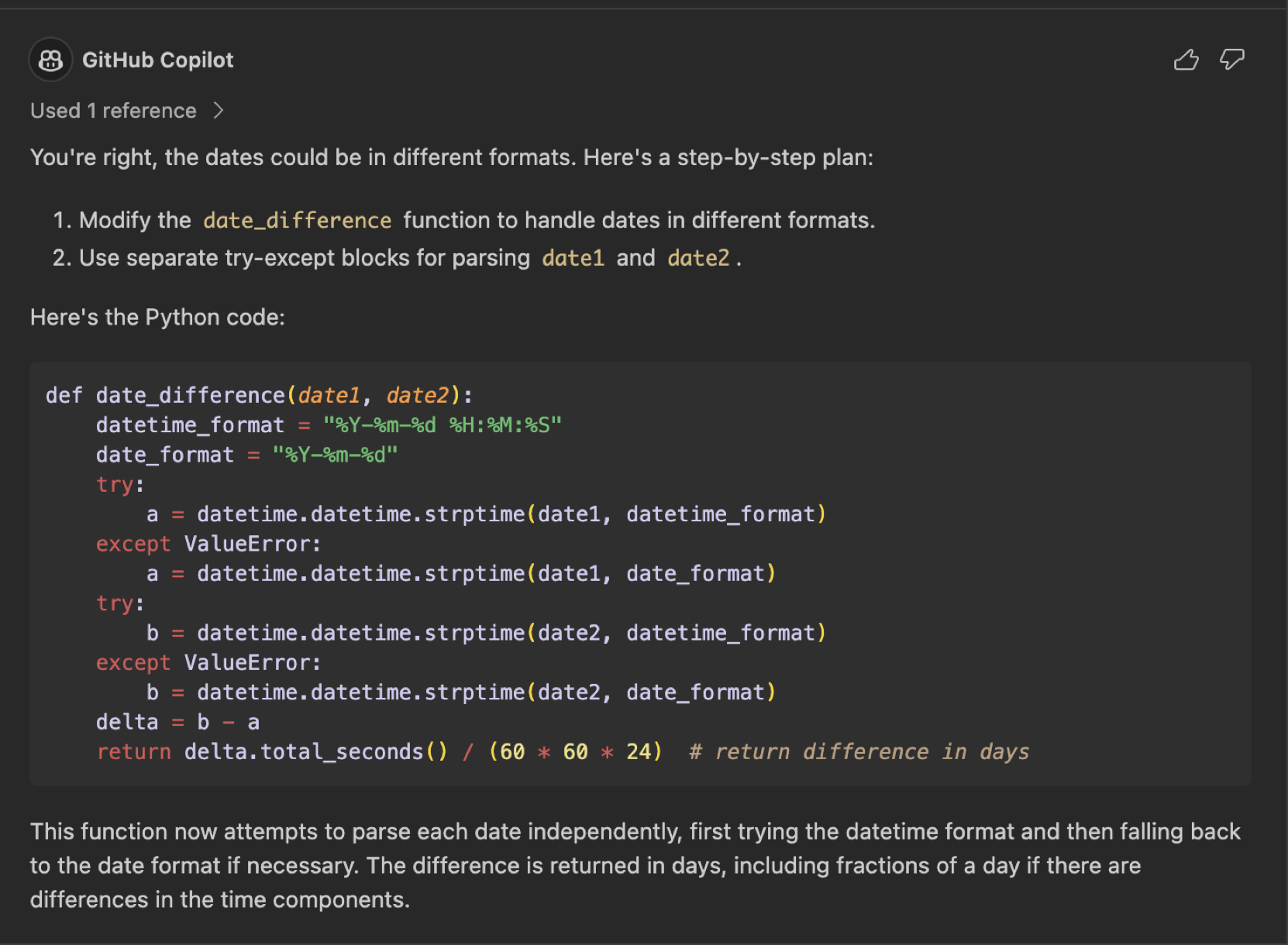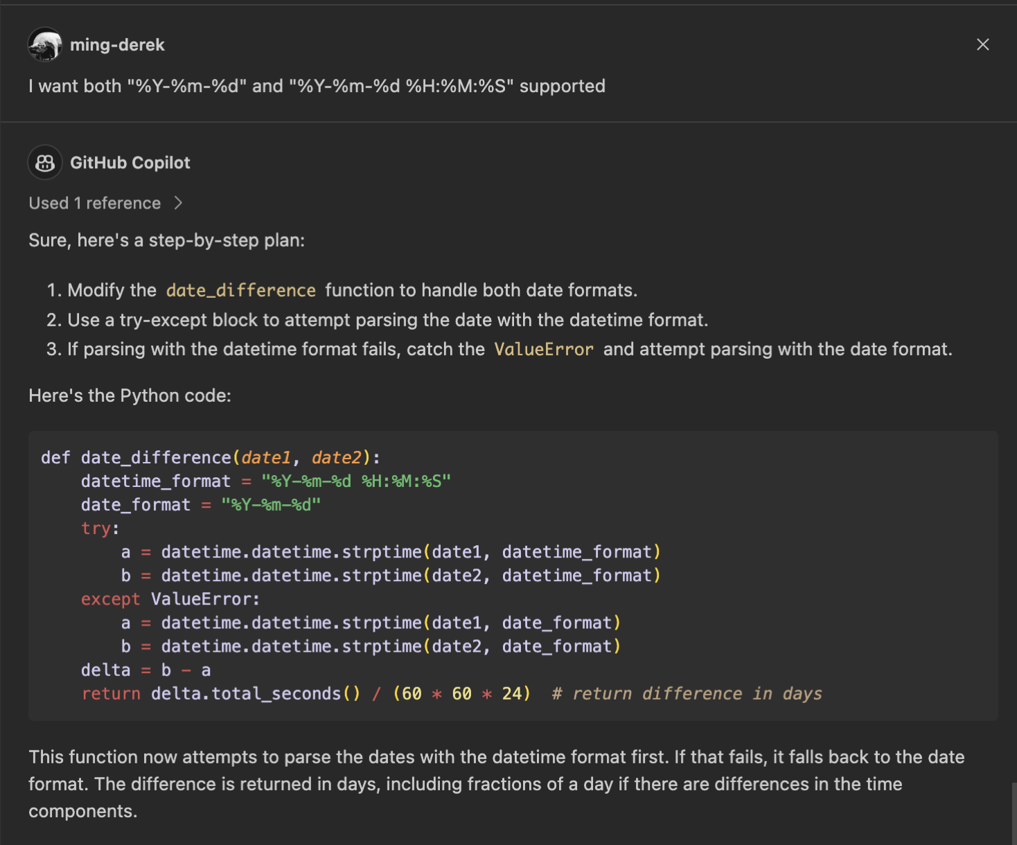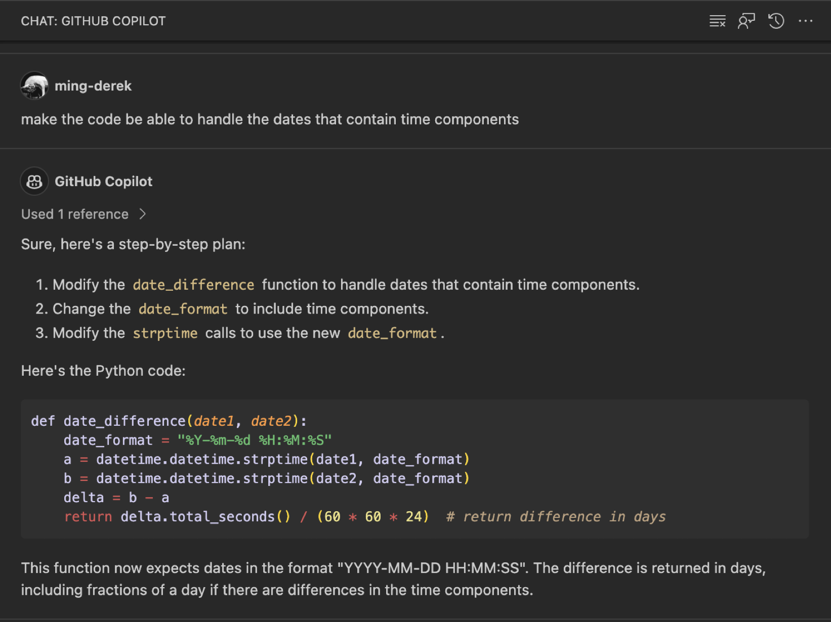 Then Copilot Chat would return the explanation along with the updated code. Verify the code after replacing it and it may surprise you.