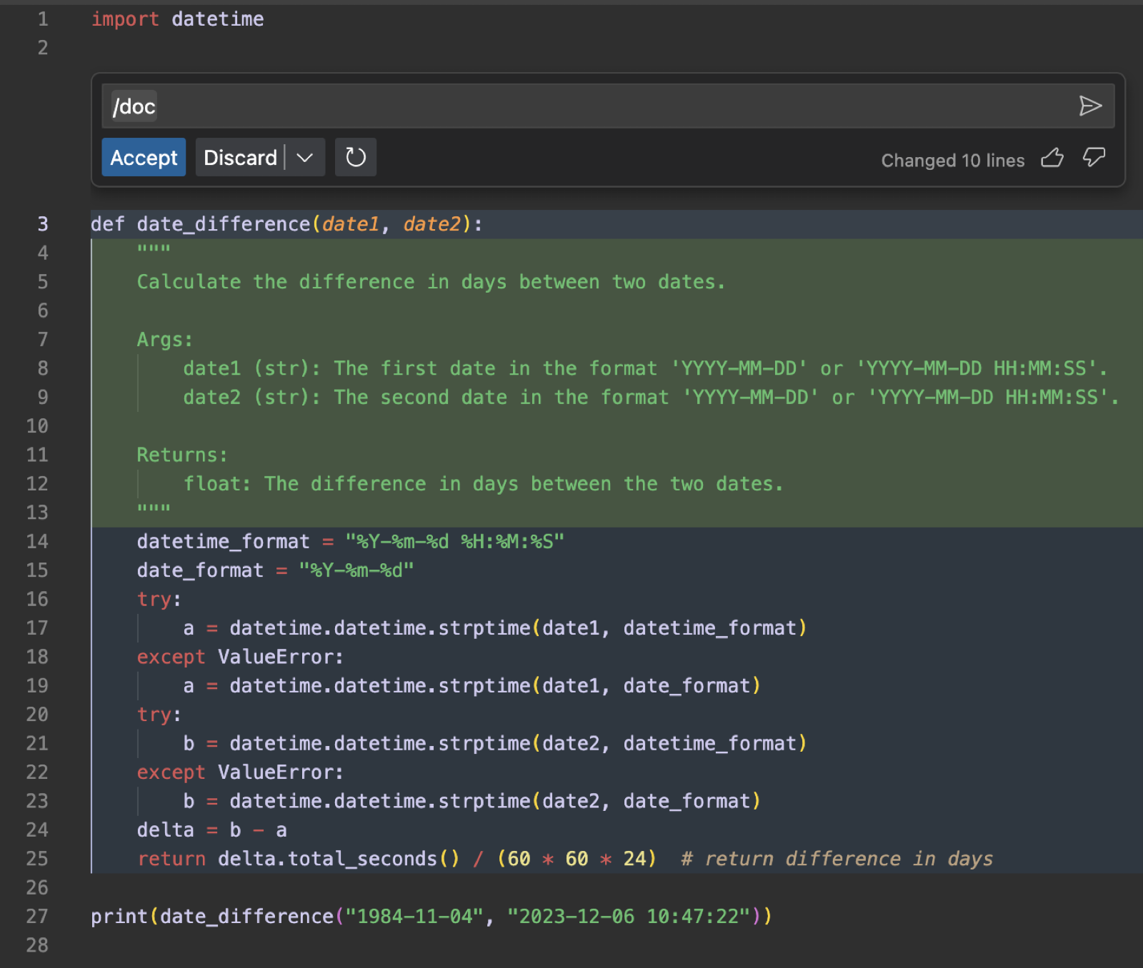 Besides the code suggestion, GitHub Copilot is able to suggest the documentation as well. This could be done in the Copilot Chat window, by selecting the relevant code and typing “generate docs”.