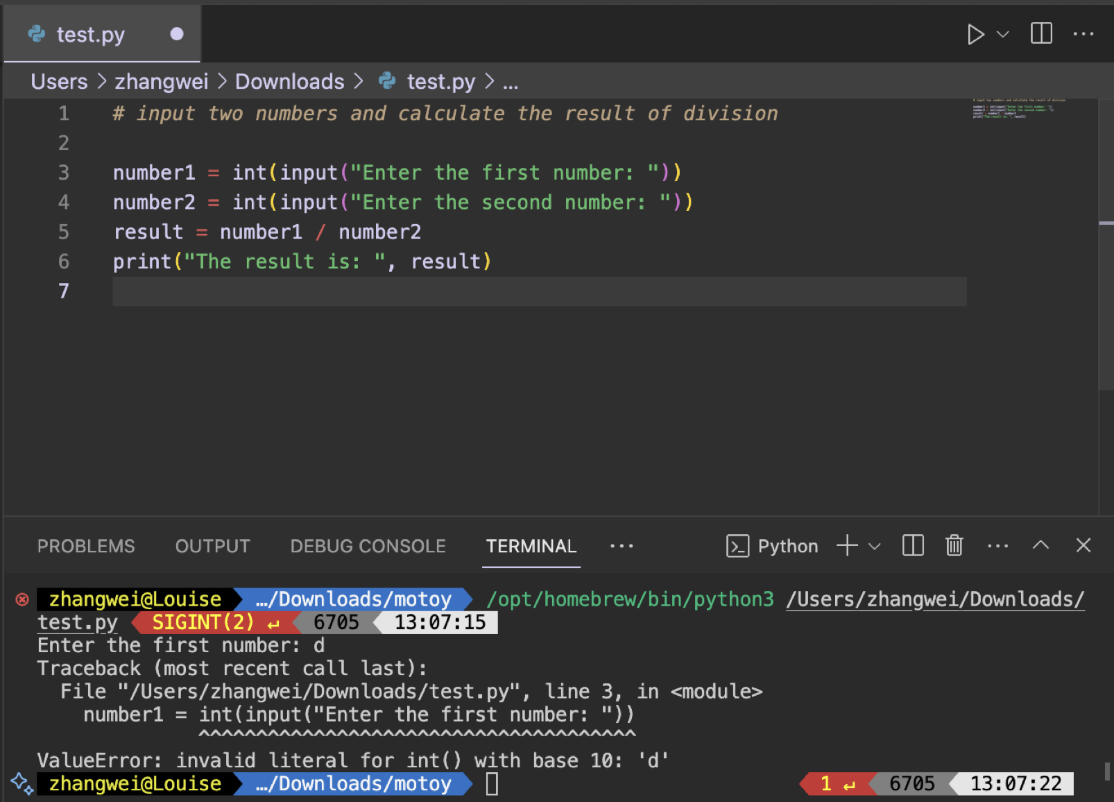 The screenshot on the right shows a simple code of a CLI program that asks the user to input two numbers and then calculate their division. It is not that robust so when non-numeric text is provided, it shows error immediately.