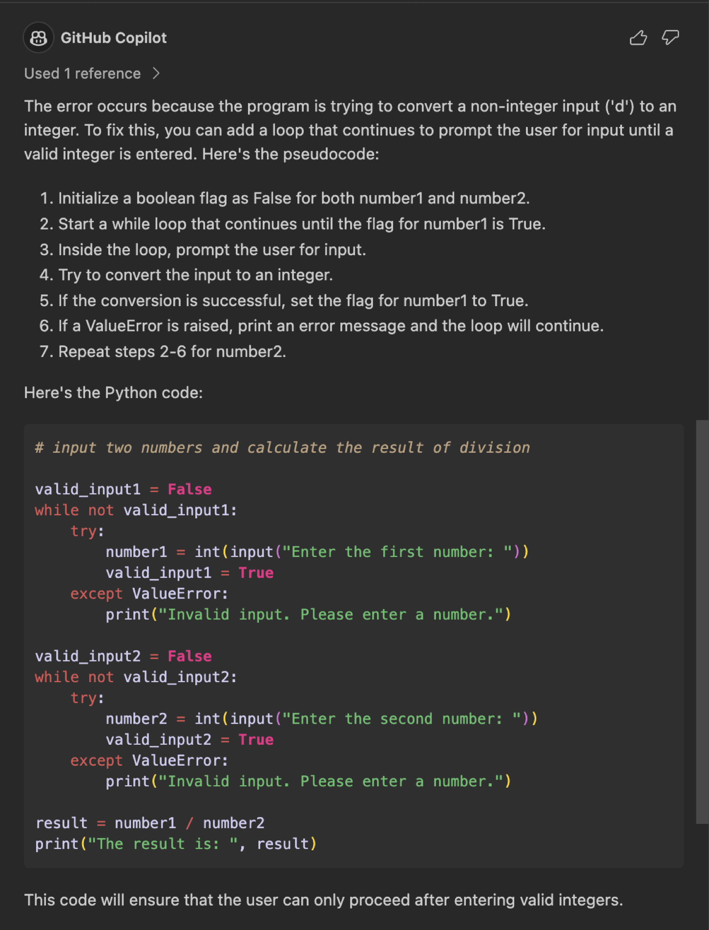 The conversation in the same chat window would be considered as in a single context. Type more messages to get a better output. E.g. “Make sure the divisor is not zero”.
