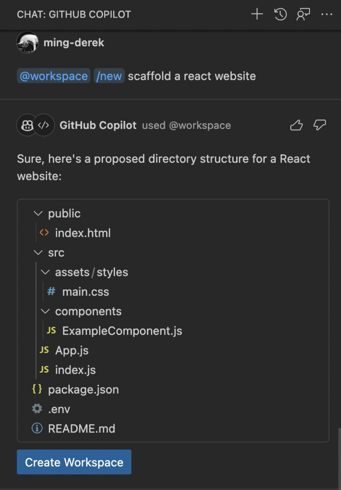 In the example, a prompt “@workspace /new scaffold a react website” is sent, and a project directory structure is proposed. If you are good with it, click the “Create Workspace” button to really perform the action.