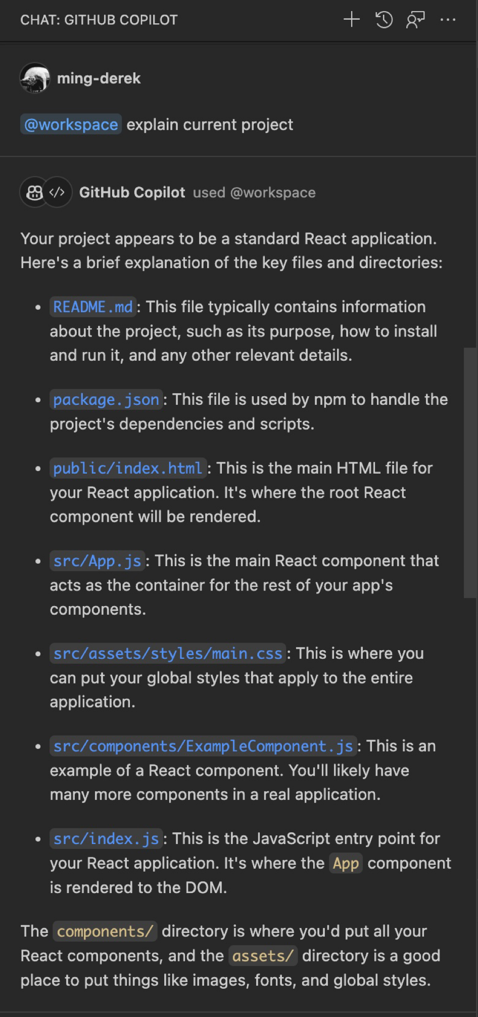 In the example, you could find out that Copilot understands the workspace is a React application project, and give a detailed description of each file.