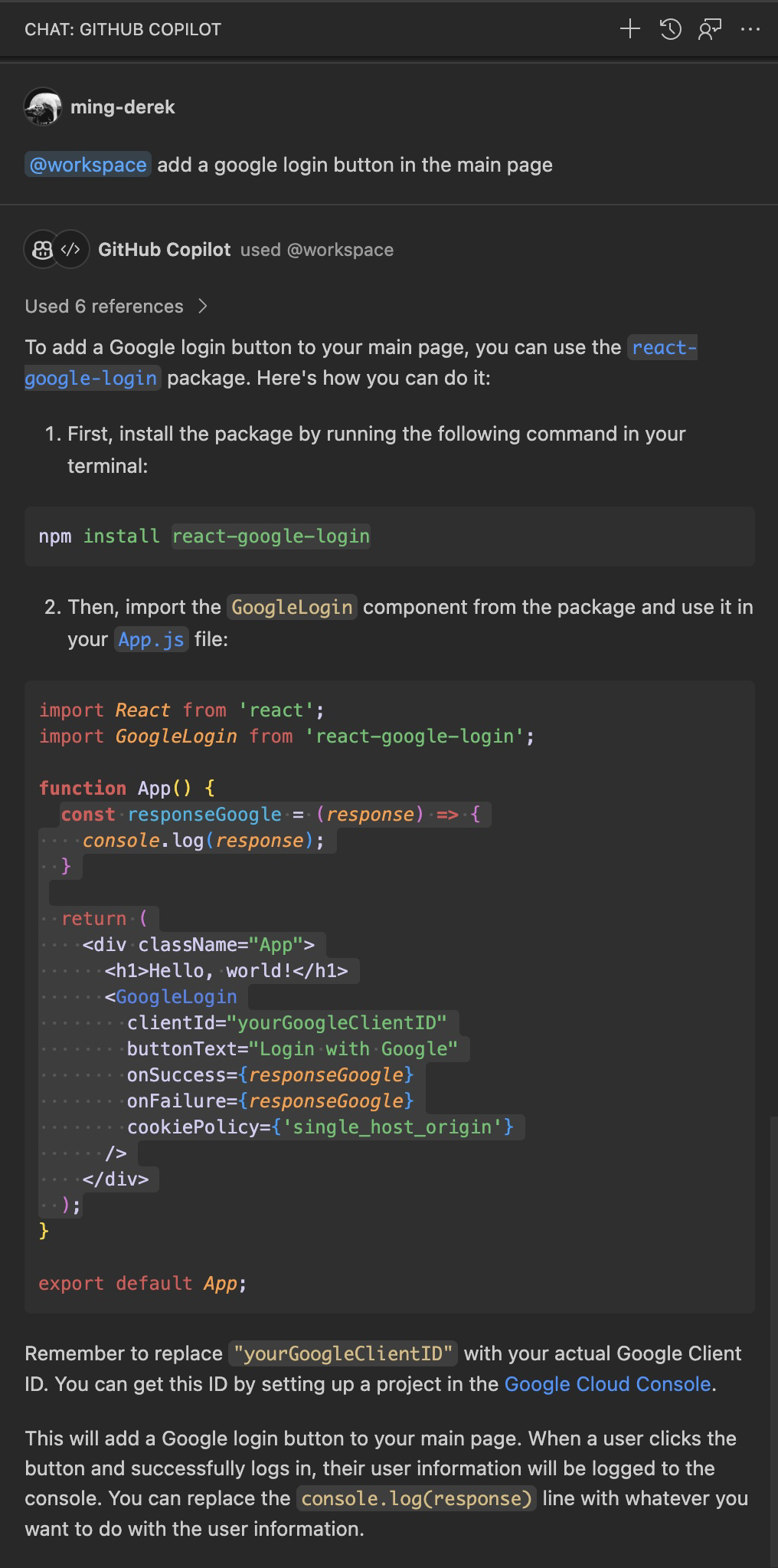 In the example, we send a prompt “@workspace add a google login button in the main page”. Copilot would suggest you install the required package first and is smart enough to suggest you put the code snippet in App.js, which is indeed the main page of the project.