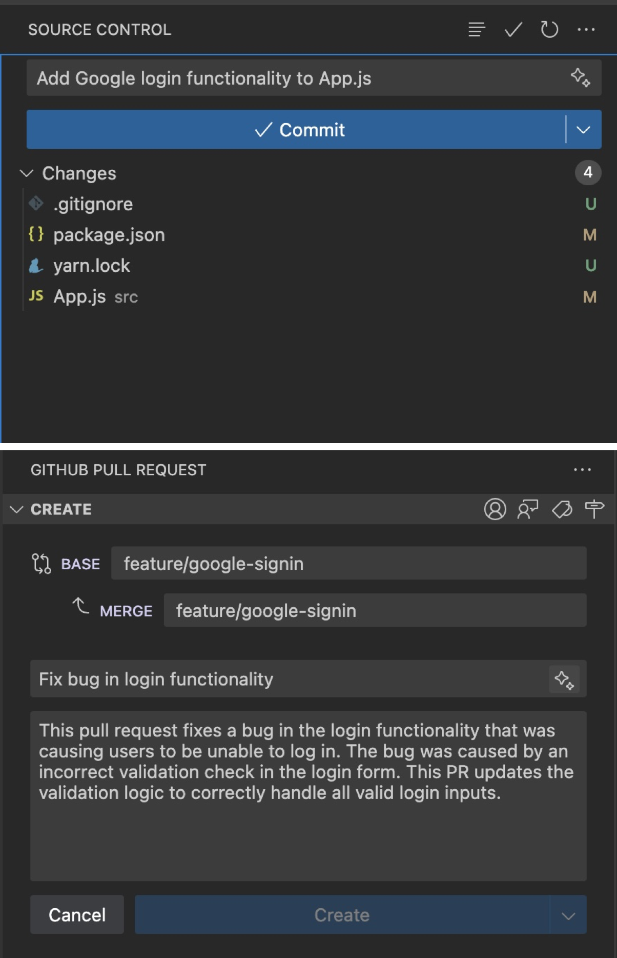 In the example, we leverage the Copilot button to generate the commit message and the PR description for us.