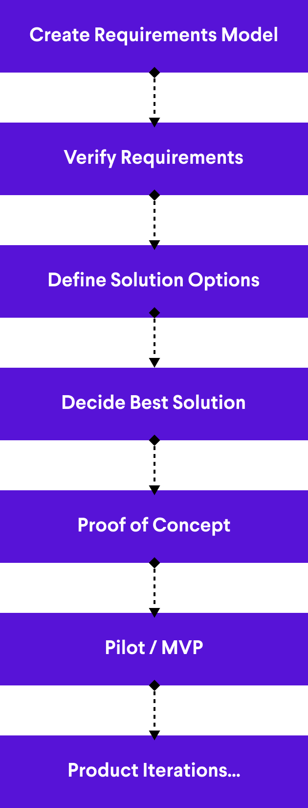 When change strategies and requirements are defined, the team should consider possible solutions. See the figure - solution options are to be defined after the requirements are verified and signed off by the stakeholders and before moving on to PoC.