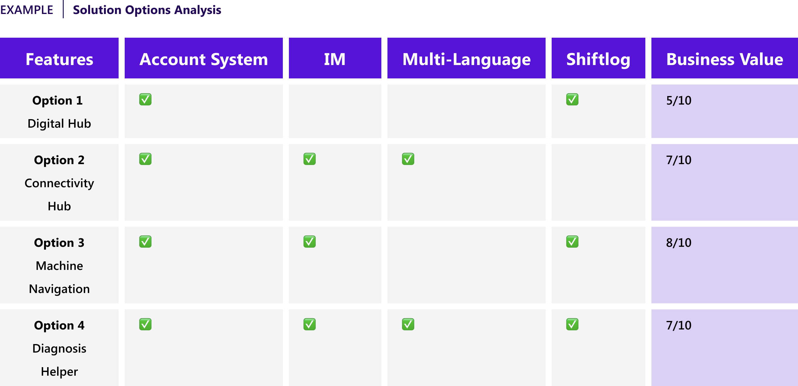 Solution options analysis is not performed only by business designers or analysts but also supported by the professional teams of marketing, technical, operational, and so on.