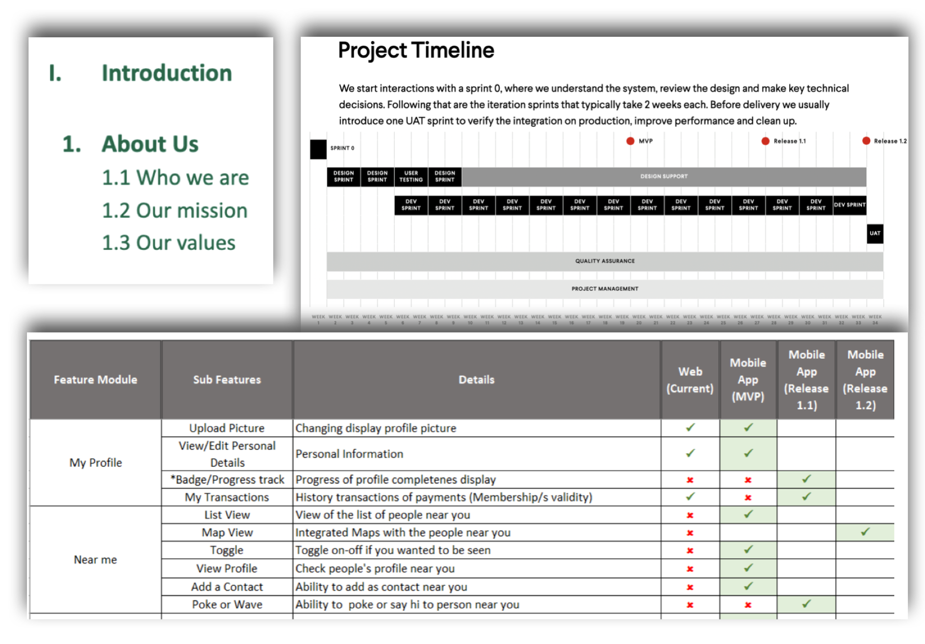 The concepts usually include the requirements, the target users, the touch points, platforms, and timeline
