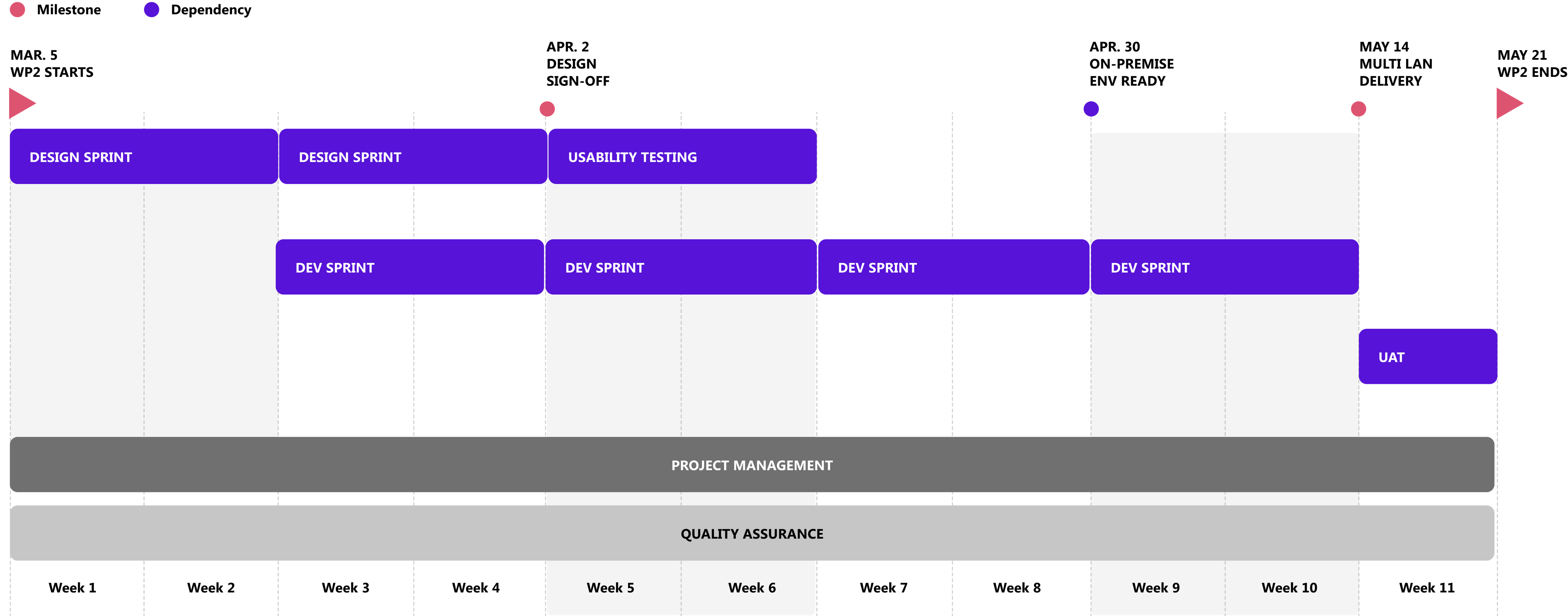 A timeline is a visual that sequences chronological events with firm start and end dates. It usually gives the viewers a quick sense of timeframes, milestones, and other concise but critical Information.