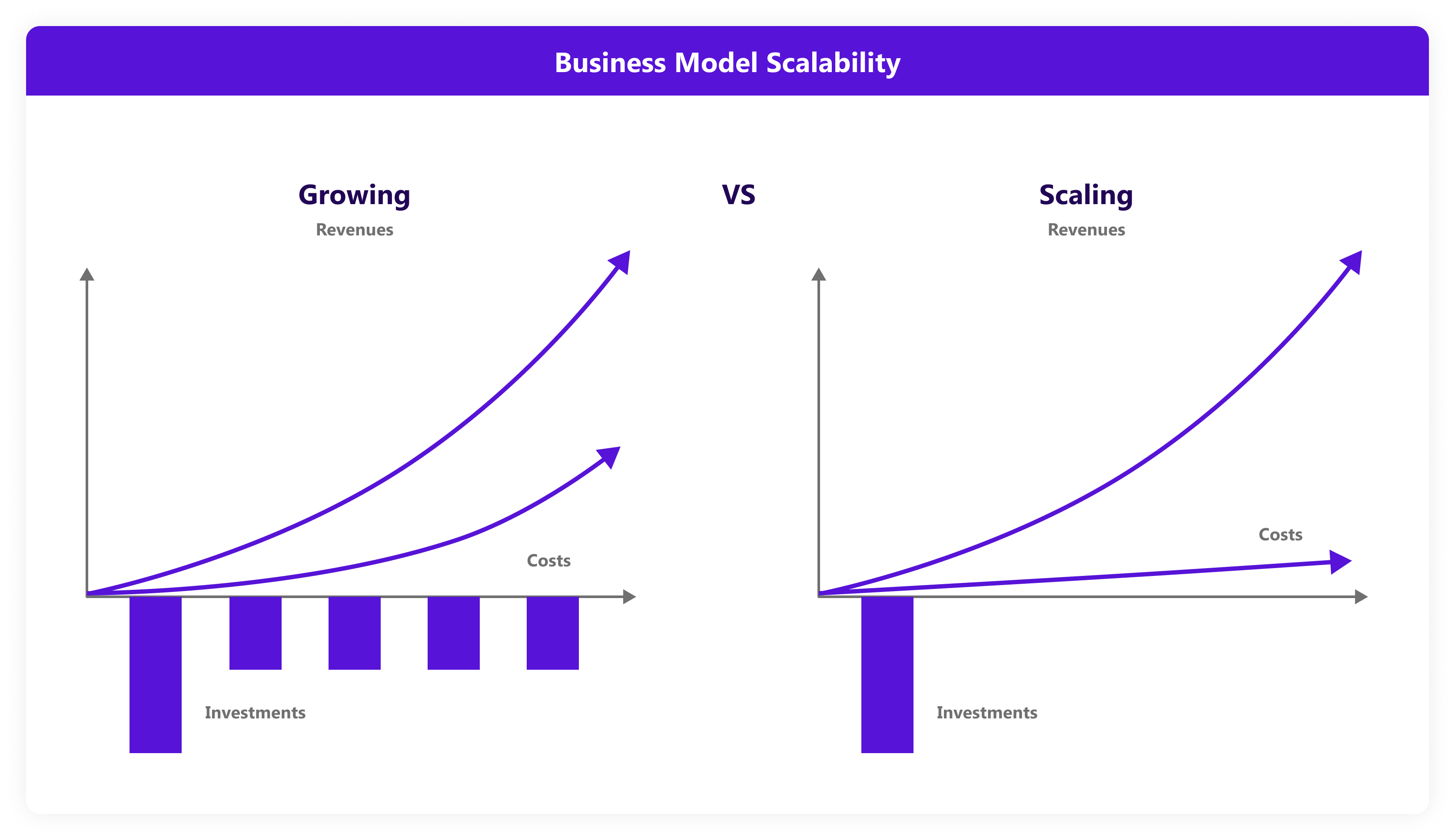 Scalability in business models refers to the effect where an increase in usage, traffic, revenues, etc., does not lead to the same increase in cost - i.e., gain and price increase at a different pace, and cost increase is significantly slower than revenue increase.