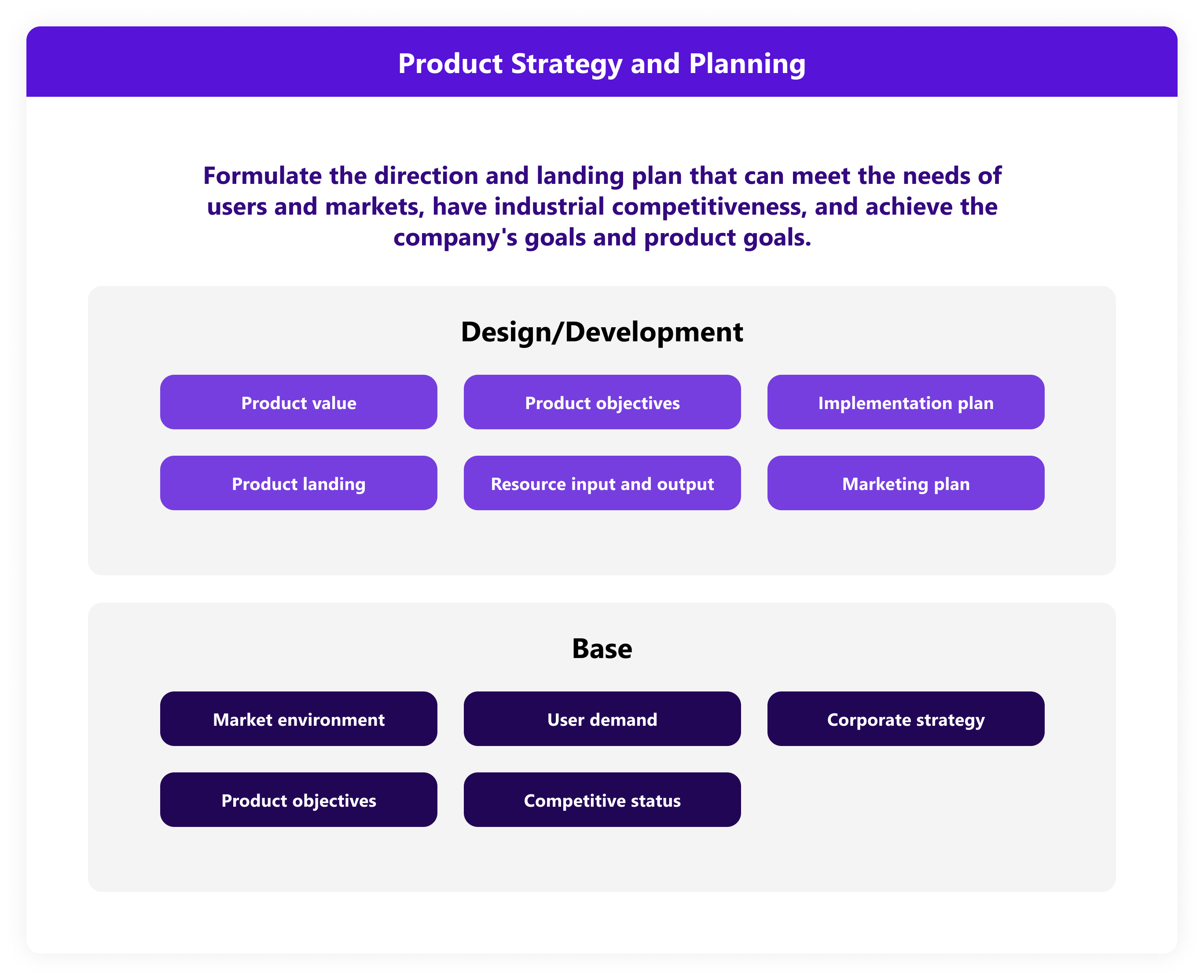 Product planning is based on the market environment, user needs, corporate strategy, competition landscape, and product objectives to design and develop the direction that can meet the needs of users and the market, formulate comparative competitiveness, and achieve strategic goals and product objectives of the company. It should fully align with corporate strategy and reflect on the product side.