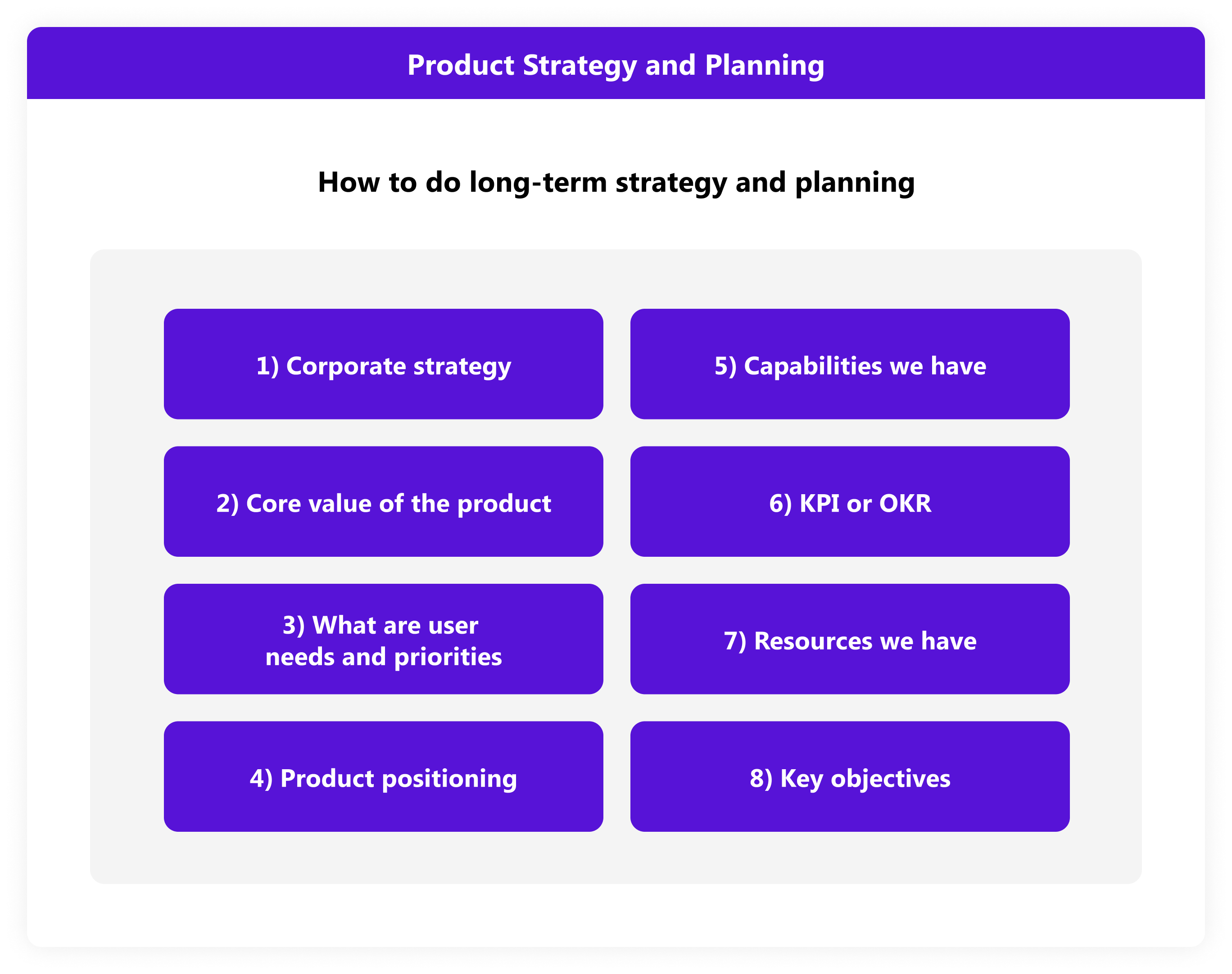 Product planning can be long-term planning and short-term planning. Long-term planning focuses on long-term goals and value sets, while short-term planning focuses on actions and tasks of product iterations.
