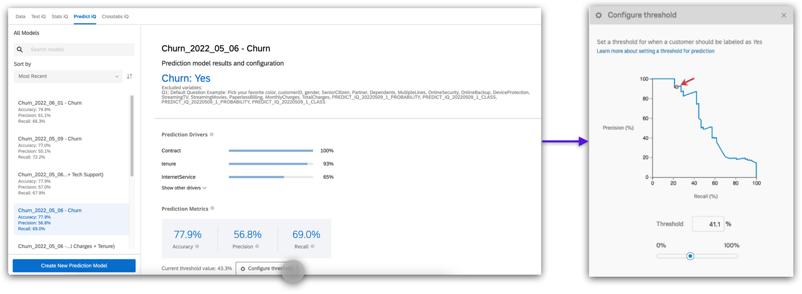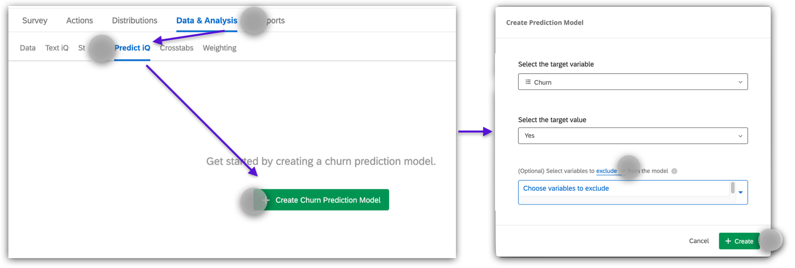 Users can utilize Qualtrics' Predict iQ feature to forecast the likelihood of a respondent churning based on their survey responses, enabling early intervention with at-risk user segments. Predict iQ employs neural networks and regression analysis to construct and select the most suitable model for the dataset.