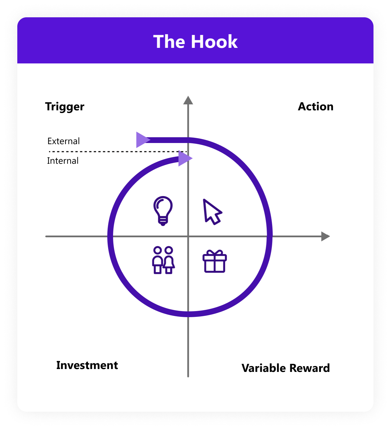 Nir Eyal and Ryan Hoover put forward the Hook Model. It is mainly about how to keep users with products for the long term. It is four-phase logic that enables users to form use habits, including four elements: Trigger, Action, Reward, and Investment.