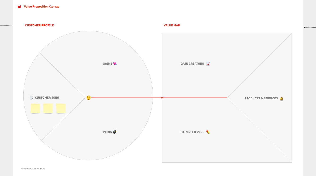Start by filling in the right side of the Value Proposition Canvas - the customer’s Jobs-To-Be-Done, pains, and gains. Try to be holistic, and include functional, social, and emotional aspects in all these fields.