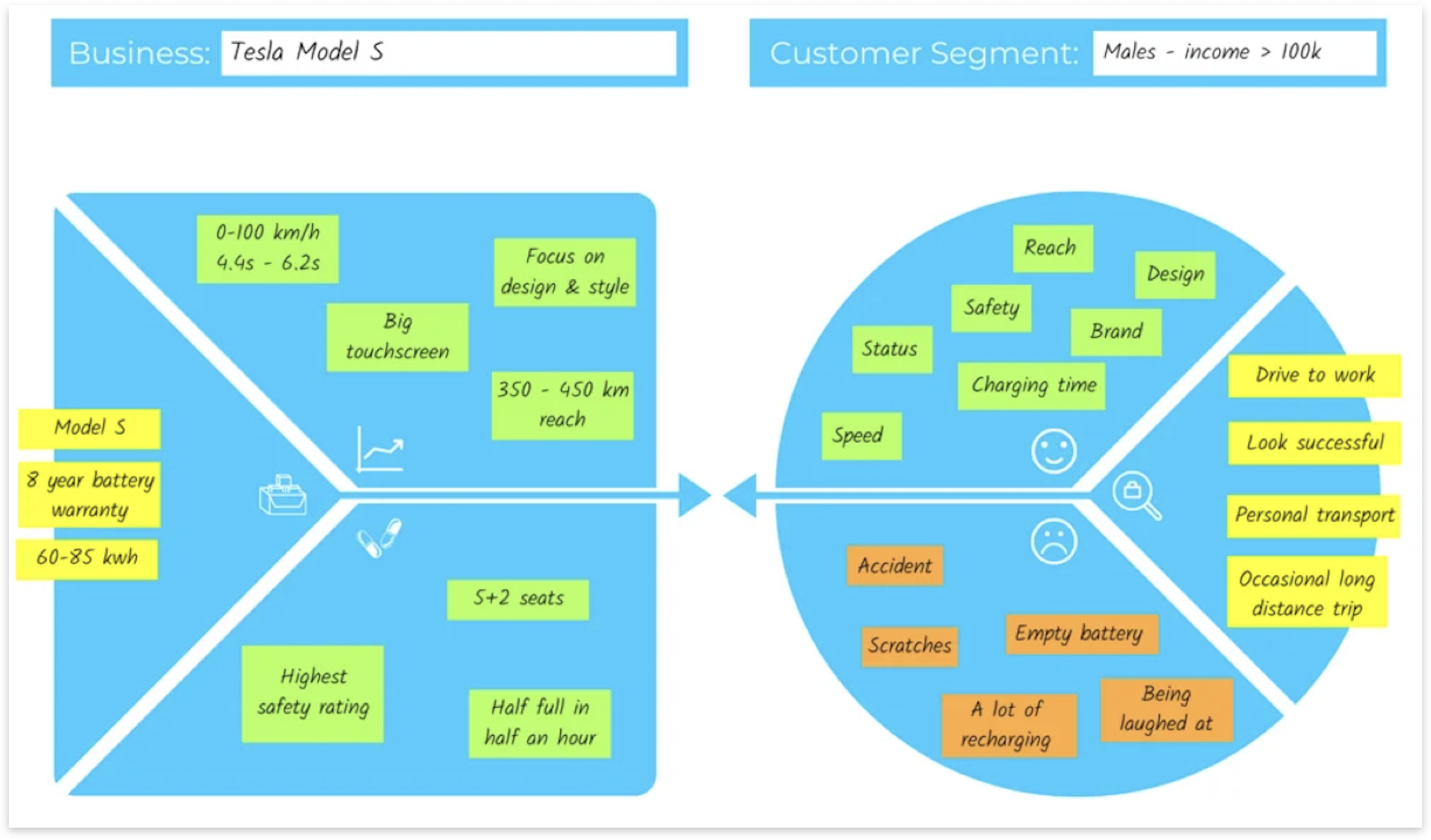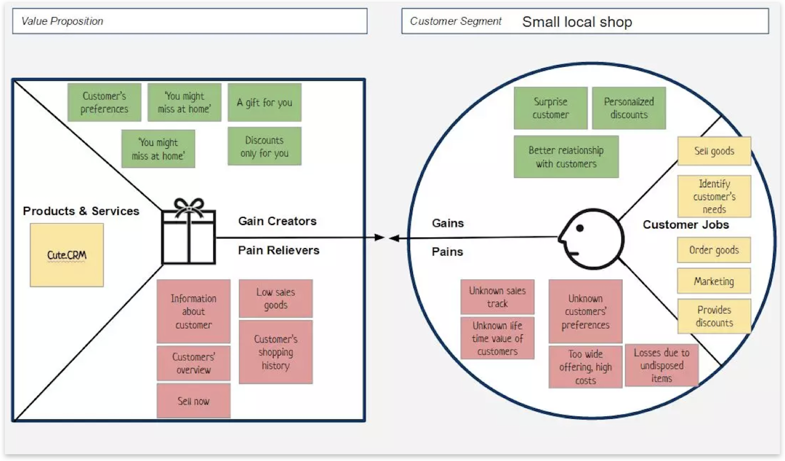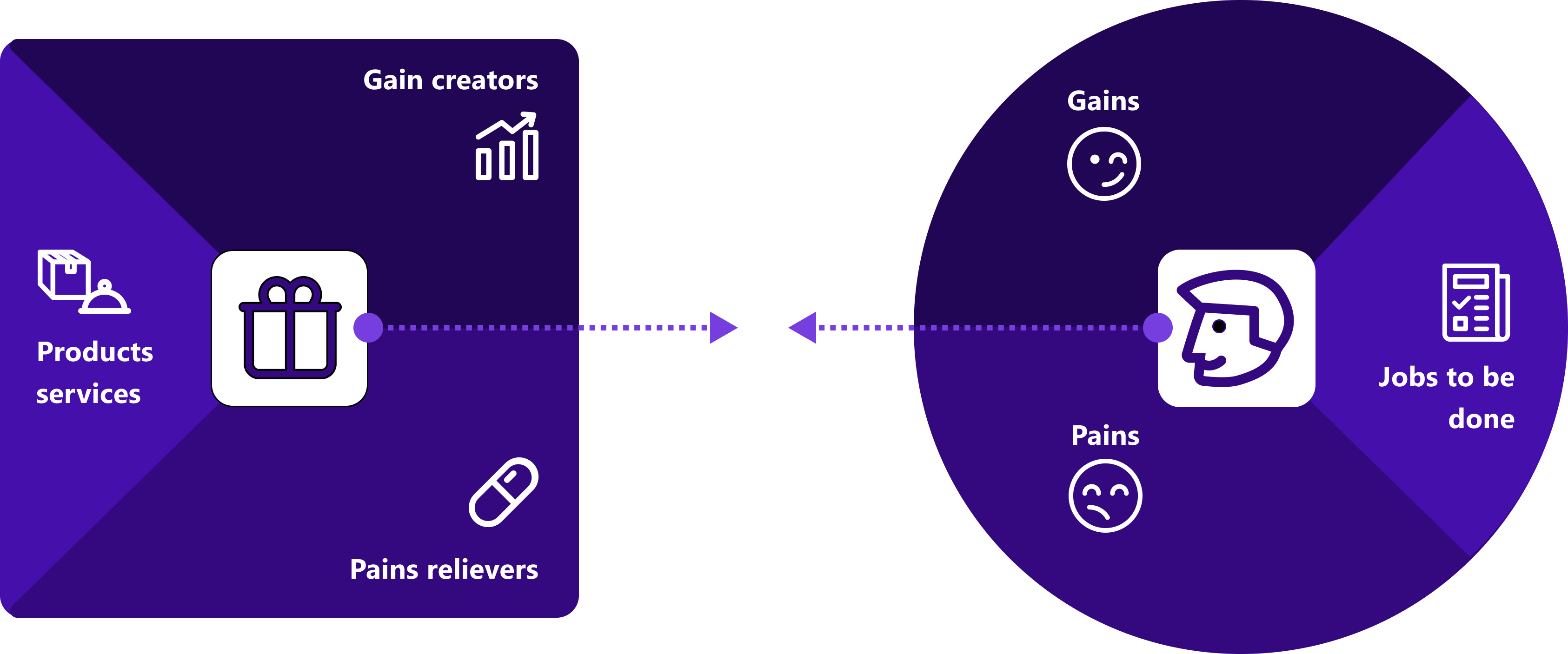The Value Proposition Canvas maps the Jobs-To-Be-Done, Pains, and Gains of a target customer (which should be based on a persona developed from research) with the Offering, Pain Killers, and Gain Creators of a product or concept to help visualise how well a given product or service will address the persona. It is an evaluative tool that can help analyse and strengthen concepts.