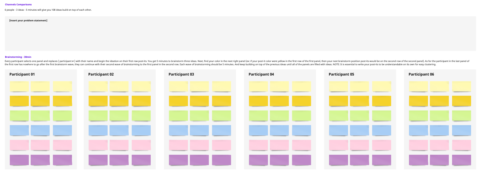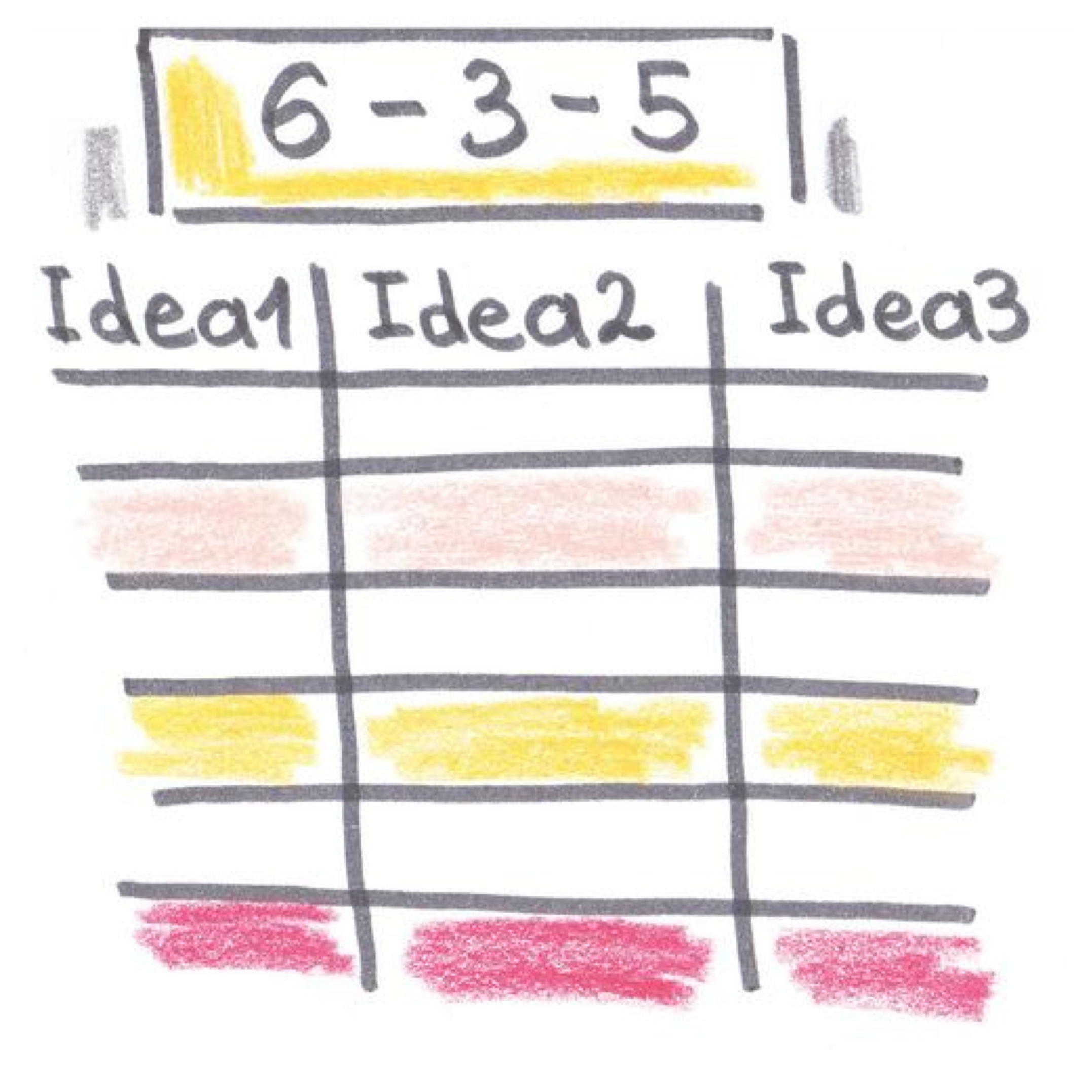 In this method, six people individually note three ideas in five minutes. Once time is up, idea sheets are passed on to the other group members to extend ideas. The process is repeated several times until each person has worked on each idea sheet. Of course, this method is not restricted to 6 people; you can adjust according to your setting.