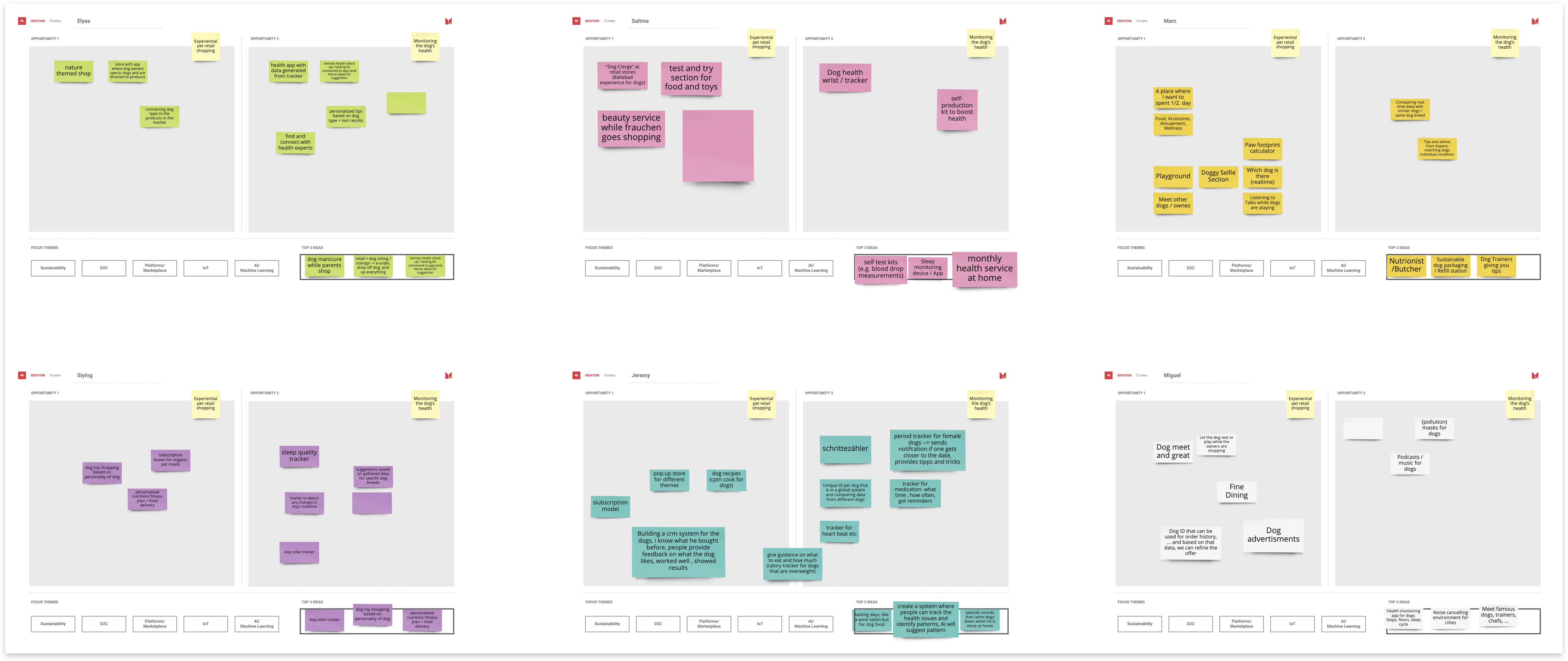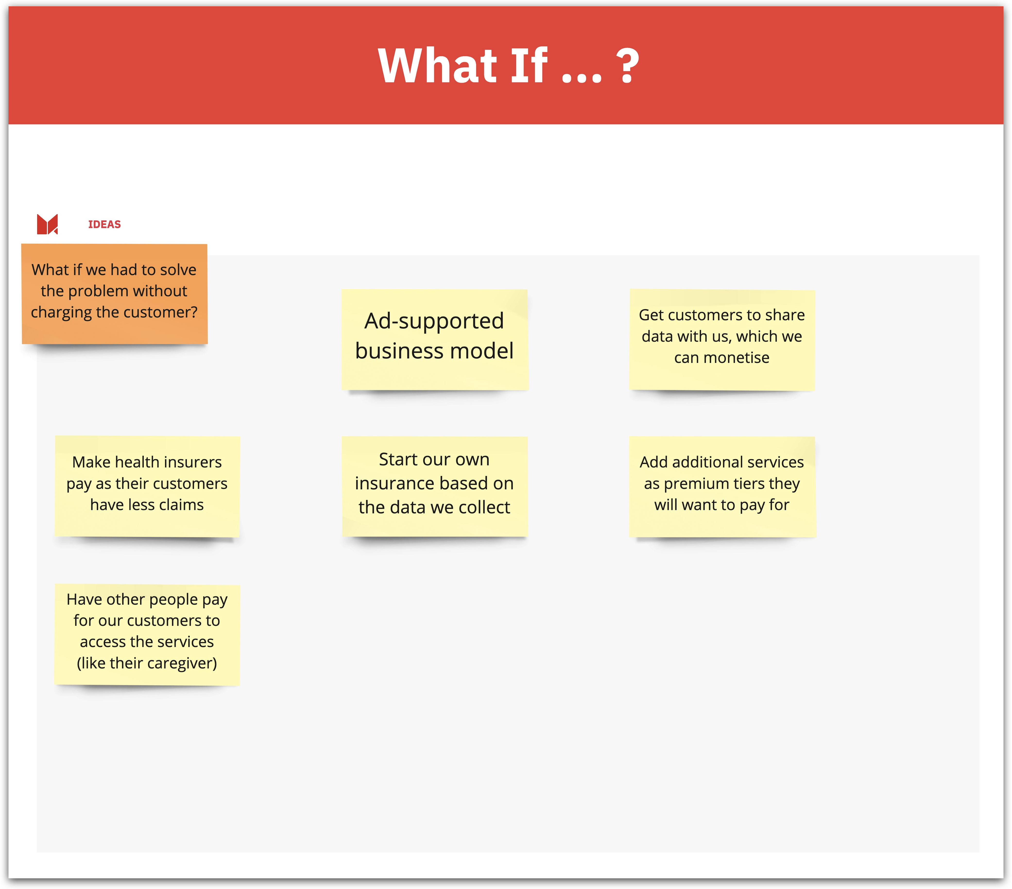 You can use the tool individually or during an ideation workshop. It allows a group of people to brainstorm many ideas simultaneously in a short time. A brainstorming session is often based on the HMW questions you have previously formulated.