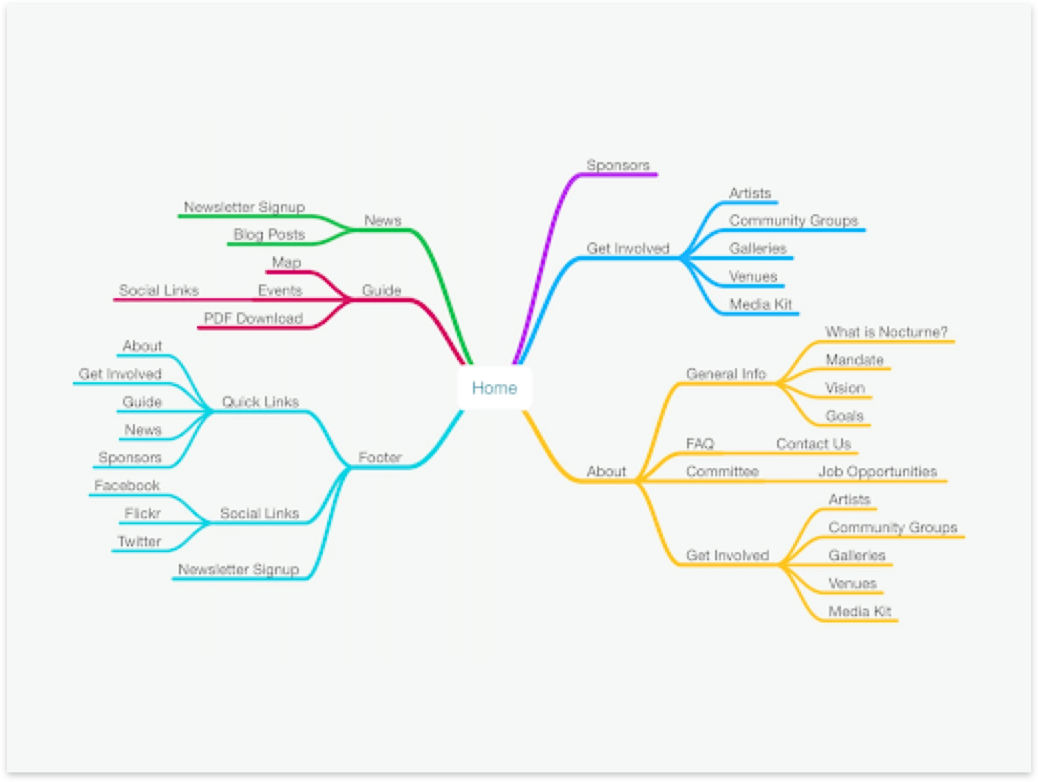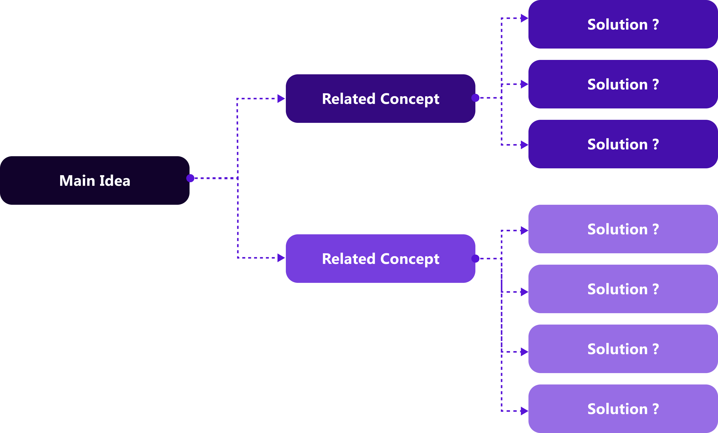 A Mind Map visually organises ideas around a central idea. Like tree branches, sub-ideas and related keywords are extended from the main idea. Ideas become more granular the further away they are noted from the central idea.