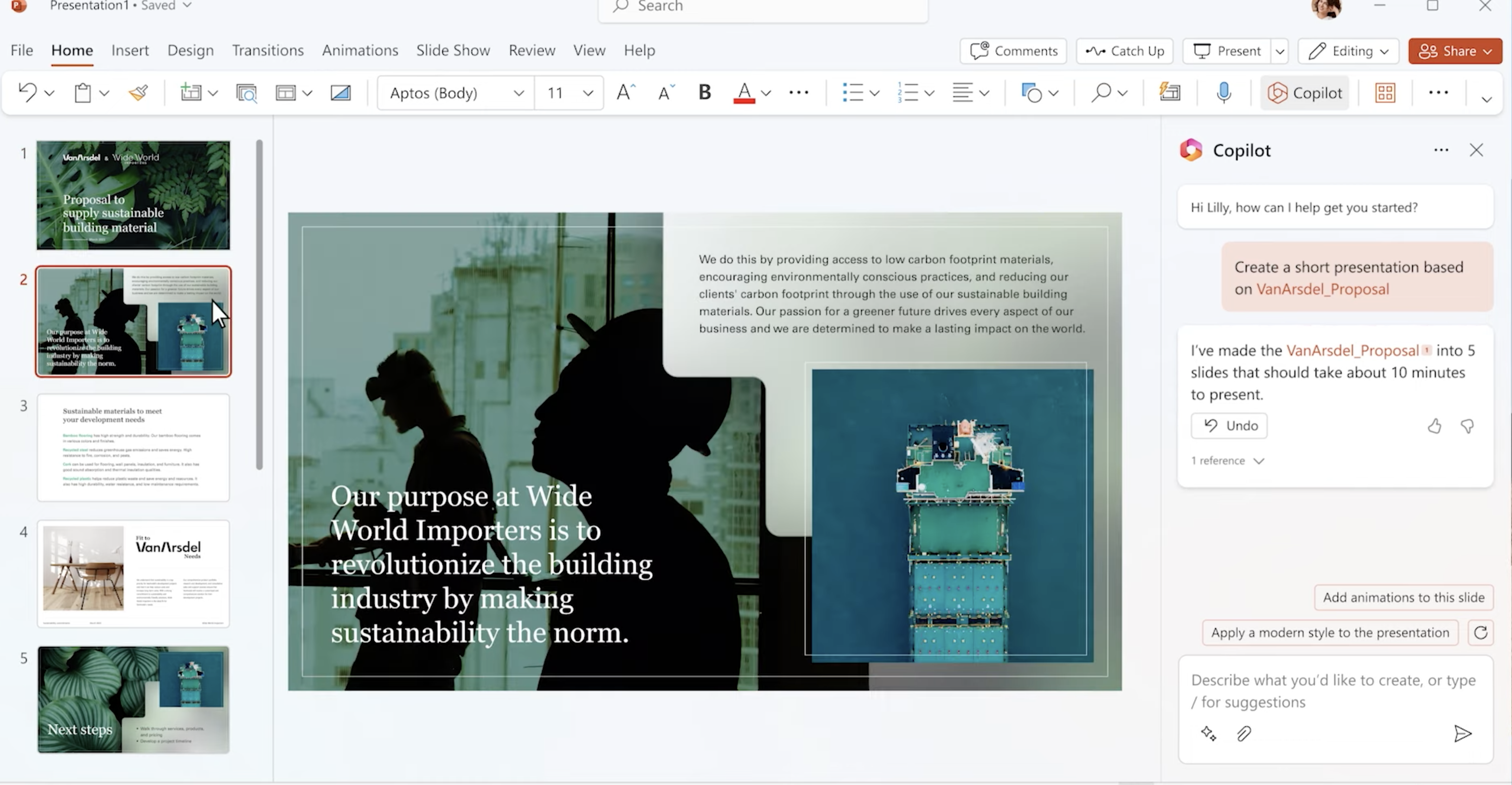 Microsoft Copilot revolutionizes pitch deck creation by simplifying the process and freeing users from manual tasks. Using Copilot in PowerPoint, you can create a presentation from an existing Word document. Provide a link to a Word document for Copilot in PowerPoint, which will generate slides, apply layouts, and select themes for you.